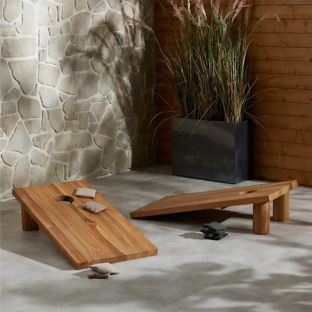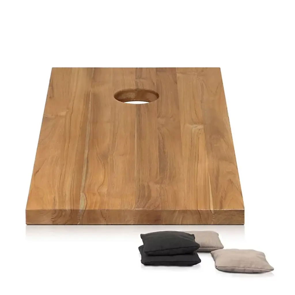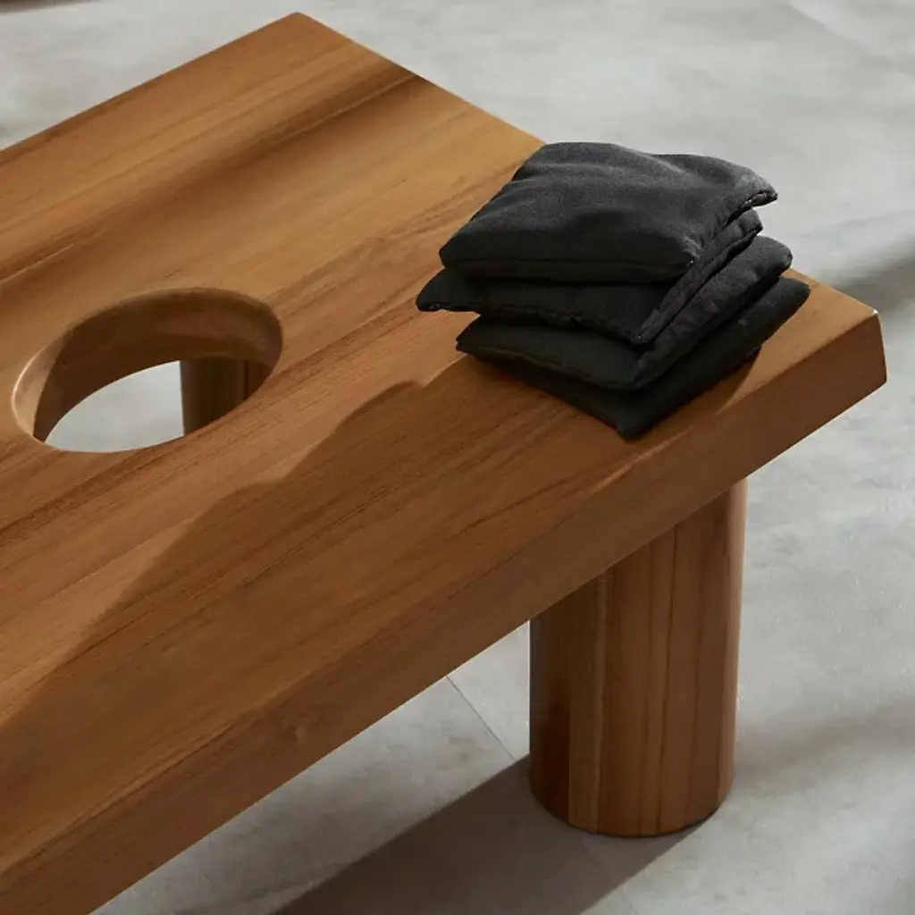 The Outdoor Bag Toss Set from Four Hands brings fabulous fun to outdoor gatherings. Made from solid teak, the two regulation-size boards offer both durability and natural beauty that will naturally earn a patina with exposure to sun and use. A set of contrasting charcoal and beige colored bags complete the set, while the table legs can conveniently unscrew for compact storage when not in use. Great for backyard games or beachside competitions, this set blends quality craftsmanship with effortless entertainment, ensuring lasting outdoor enjoyment.