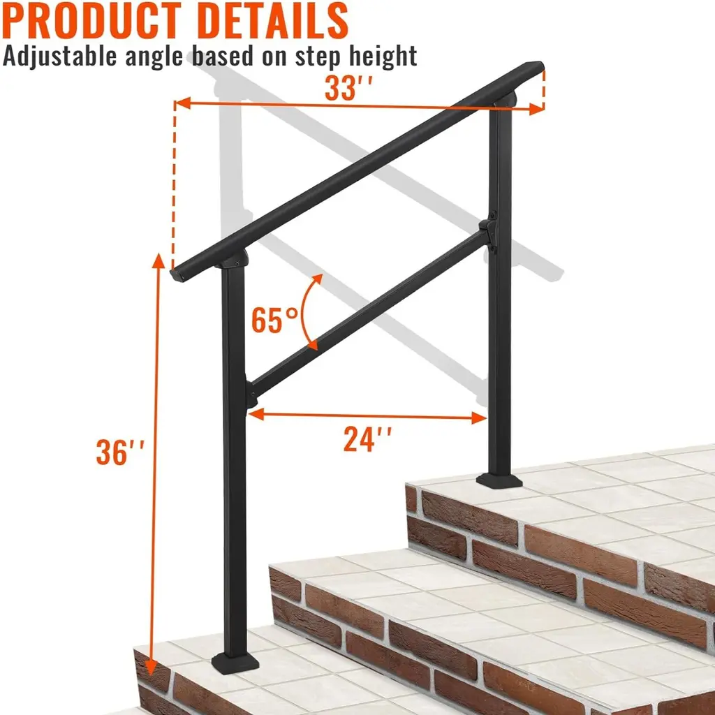 Rugged Durability: Engineered with aluminum alloy rails and wrought iron posts, the Outdoor Handrail ensures lasting stability and longevity. Its protective black powder coating shields it from outdoor elements, safeguarding against rain, snow, and harsh weather conditions. Safety Combined with Stylish Appeal: Prioritizing safety and aesthetics, our outdoor stair railing offers a comfortable grip with a textured powder-coated surface for secure handling, even in wet environments. Ideal for seniors, children, and individuals with mobility challenges, these outdoor railings provide peace of mind and accident prevention. Adjustable Height for Flexible Installation: Customize the handrail to your desired step height effortlessly, without the need for complex rail modifications. With an extensive adjustment range of 0-65°, this versatile design accommodates various heights and can be installed on both horizontal and vertical surfaces, ensuring a perfect fit for your specific installation needs. Effortless Installation: All essential installation accessories are included for a swift and straightforward setup process. Simply select the installation position, mark it, drill holes on the mounting surface, install the screws, and secure the base cover onto the fasteners for a seamless installation within minutes. Enjoy the convenience of easy maintenance and a hassle-free installation experience. Wide Range of Applications: The handrails for outdoor steps can be effortlessly installed on various surfaces such as concrete, brick, or wooden decks. Whether on porches, balconies, gardens, residential buildings, hotels, or garages, these sturdy railings offer support and safety.
