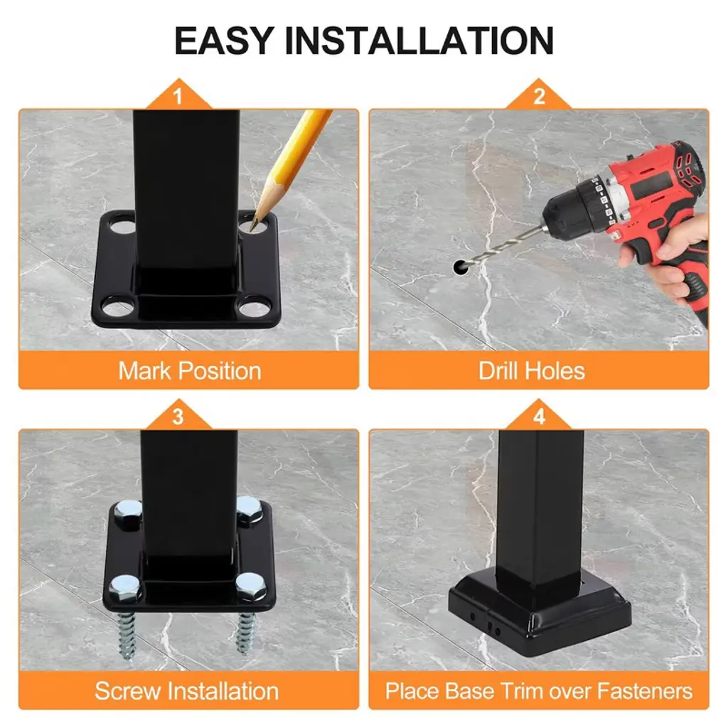 Adjustable Handrail: Suitable for 1 or 3 steps and horizontal surfaces.Adjust the middle rail to make two posts vertical to the ground. Max height for steps: 12.99"/33 cm, posts height :38.19"/97cm , upper post length 35.43"/90cm, distance between posts: 22.44"/57cm. Delicate Design: Circular design makes your grip more comfortable.The one-piece design of the handrail end prevents water from entering the interior and avoids rusting. Handrail steps features a smooth powder-coated surface with chic black, which allows you to clean it with water or cloth easily and quickly. Reliability Connection: New joint design makes the whole thing more stable.Secure hardware connection, providing protection from sharp metal edges.The sturdy and durable hardware offers stability and support, creating a safer environment for use. Easy to Install: The package includes impact drill bits, expansion screws, self-tapping screws, and various other accessories suitable for concrete, wood, and brick floors. Extensive Use: The step railing provides added safety for elderly, children, pregnant women, disabled family members, and individuals recovering from surgery. It can be installed on concrete, brick, and wooden steps of porches, balconies, gardens, residential buildings, hotels, garages, etc. Ihis outdoor railing is perfect for locations where attachment to a wall or structure is not possible.