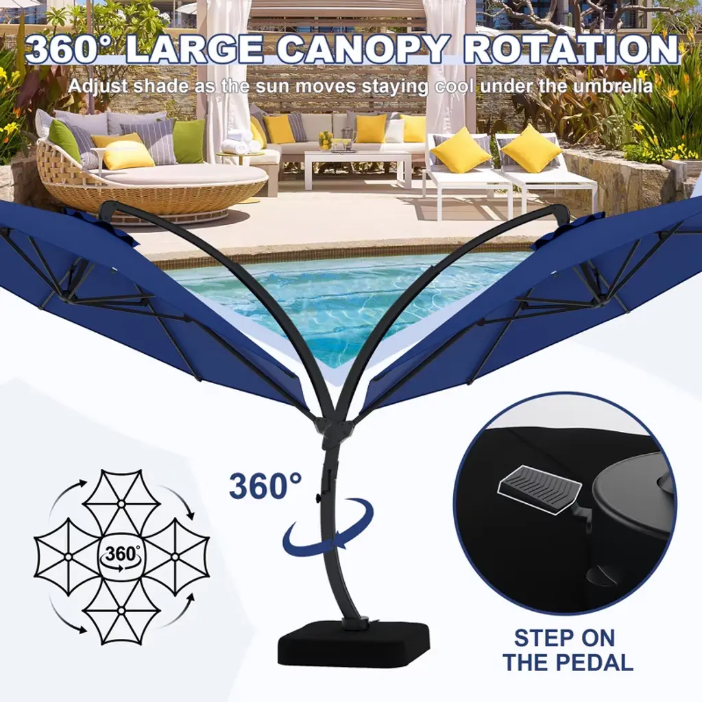 350LBS BASE INCLUDED FOR STABILITY - No extra purchases are needed this large offset umbrella outdoor patio comes with a base included, ensuring stability and support right out of the box. To maximize stability, fill the base with 300 lbs of sand first, then wet it with water in sequence 360¡ã ROTATION & INFINITE TILT FOR FULL SUN CONTROL - Maximize shade coverage with smooth 360¡ã rotation and precise infinite tilt adjustment. Easily block sunlight from any angle whether on a pool deck, backyard, or garden, this heavy-duty outdoor essential provides reliable shade. It features a unique pedal design that allows 360¡ã rotation from the patio umbrella base: simply twist the pole to find the perfect position at any time of day SUPERIOR PATIO UMBRELLA FABRIC - The canopy of this offset patio umbrella with base included is made from 220g polyester fabric with a PA coating, featuring vents at the top for improved air circulation. This high quality craftsmanship ensures excellent water repellency, fade resistance, ventilation, and sun protection, effectively blocking strong harmful outdoor rays USE AND MAINTENANCE - To keep your outdoor cantilever umbrella with base in optimal condition and extend its service life, please close it and secure it with the strap during extreme weather (such as strong winds) or when not in use. This well designed heavy-duty patio umbrella is perfect for various outdoor spaces, including patios, poolside areas, backyards, and more PATIO UMBRELLA WITH STURDY BASE - An aluminum frame with enhanced thickness provides your patio umbrella cantilever with a strong, stable structure that withstands various weather conditions. The powder coating offers superior corrosion resistance and wear protection. Built with a heavy-duty, rust-proof aluminum pole and 8 reinforced ribs, this cantilever umbrella is designed for long-lasting durability