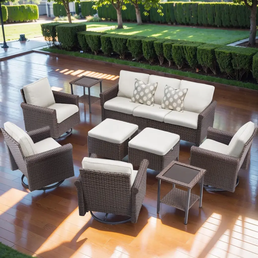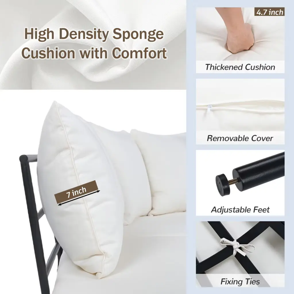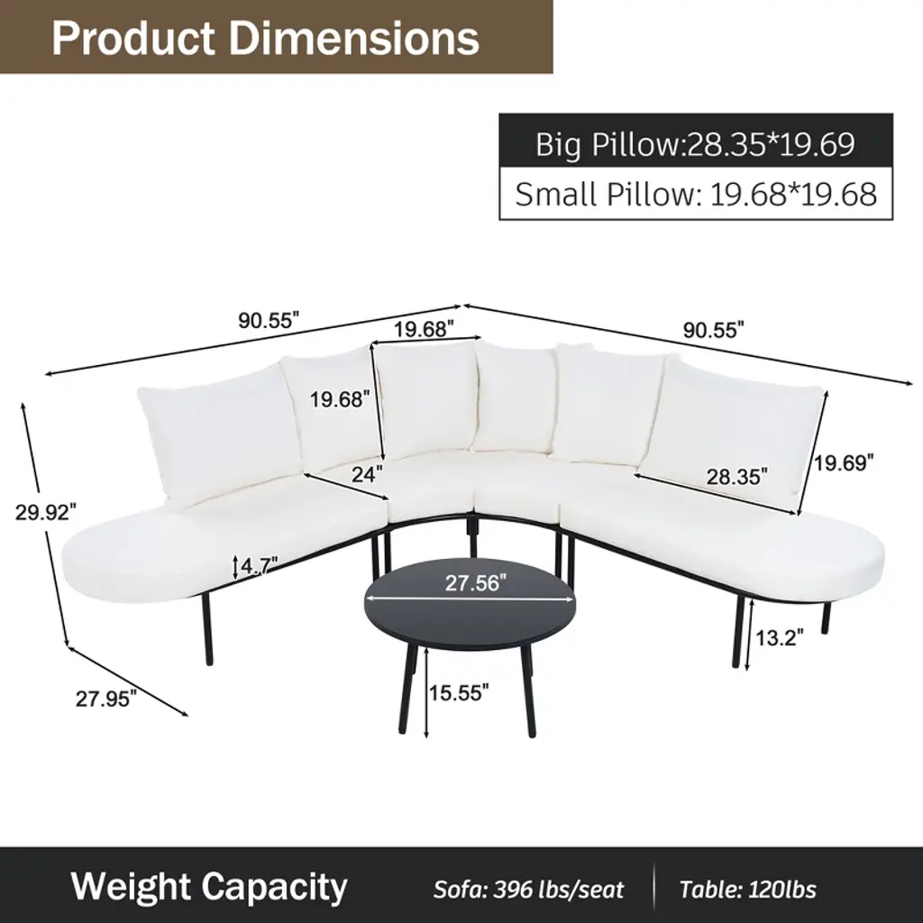 Iron Patio Furniture Set Enhance your outdoor living space with this stylish and durable iron patio furniture set. Perfect for relaxing with family or friends, this set includes comfortable seating and a spacious coffee table, ideal for enjoying snacks, drinks, or a peaceful evening outdoors. Whether on your patio, deck, porch, poolside, or in your living room, this furniture set provides comfort and style for any occasion. Product Features Spacious Space: Ideal for family gatherings, this set includes ample seating and a coffee table to place your snacks and drinks. Perfect for patios, decks, porches, poolside areas, or even your living room, offering both comfort and style.All-Weather Durable: Designed to withstand all weather conditions, the set features a thickened iron frame for long-lasting durability. The iron pipes increase the load-bearing capacity and stability, supporting up to 396 pounds per seat, ensuring a safe and luxurious outdoor experience for you and your guests.Thickened Sponge Cushion: The set comes with 4.72-inch thick cushions equipped with fixing straps, providing a soft yet firm sitting experience that is not prone to deformation. Waterproof, stain-resistant, and designed for outdoor use, these cushions ensure long-lasting comfort in any weather.Thoughtful Design: With reinforced connections and adjustable foot pads, this patio set is designed for stability on any ground surface. These features enhance the overall structure, ensuring the furniture remains sturdy and secure, even on uneven terrain.Easy to Assemble: The set comes with clear and easy-to-follow assembly instructions, making it simple to set up in just a short time, so you can start enjoying your outdoor space without delay. Product Description Capacity: Table: 120 lbsSofa: 396 lbs per seat Net Weight: Table: 20.7 lbsCurved Sofa: 26.43 lbs per pieceCorner Sofa: 32.6 lbs Material: Made of durable iron, polyester fabric, and soft sponge for long-lasting comfort and sturdiness.Assembly Time: Approximately 40 minutes to assemble the set, with all necessary parts and instructions included. Notice: Color Disclaimer: Due to lighting and display settings on your device, actual product colors may vary slightly from what appears in the images.Assembly Tip: Ensure all screws are loosely fitted during assembly until all parts are aligned, then tighten them for maximum stability.Weather Protection: To extend the life of your furniture, cover or store it during extreme weather conditions.