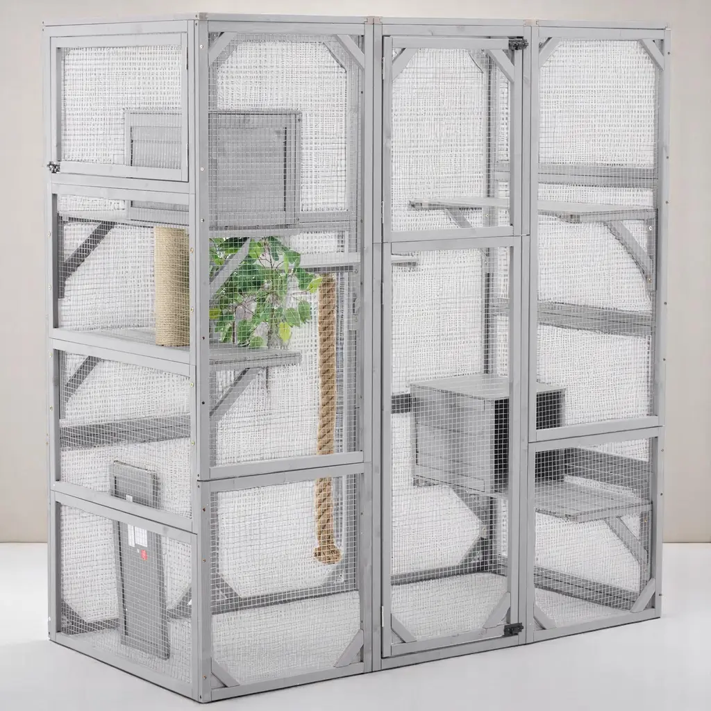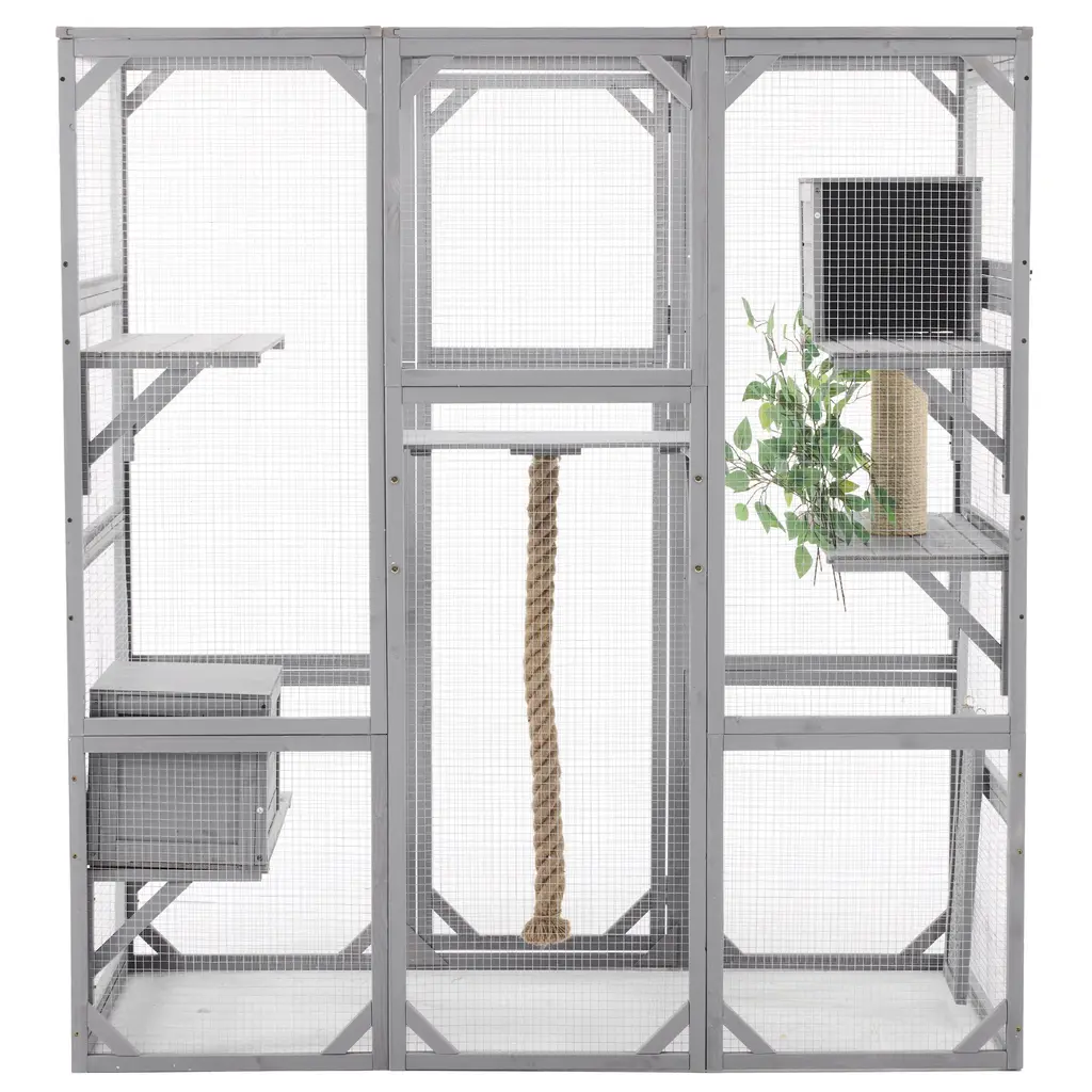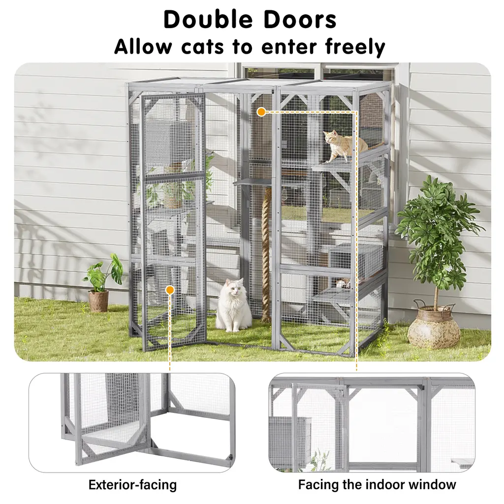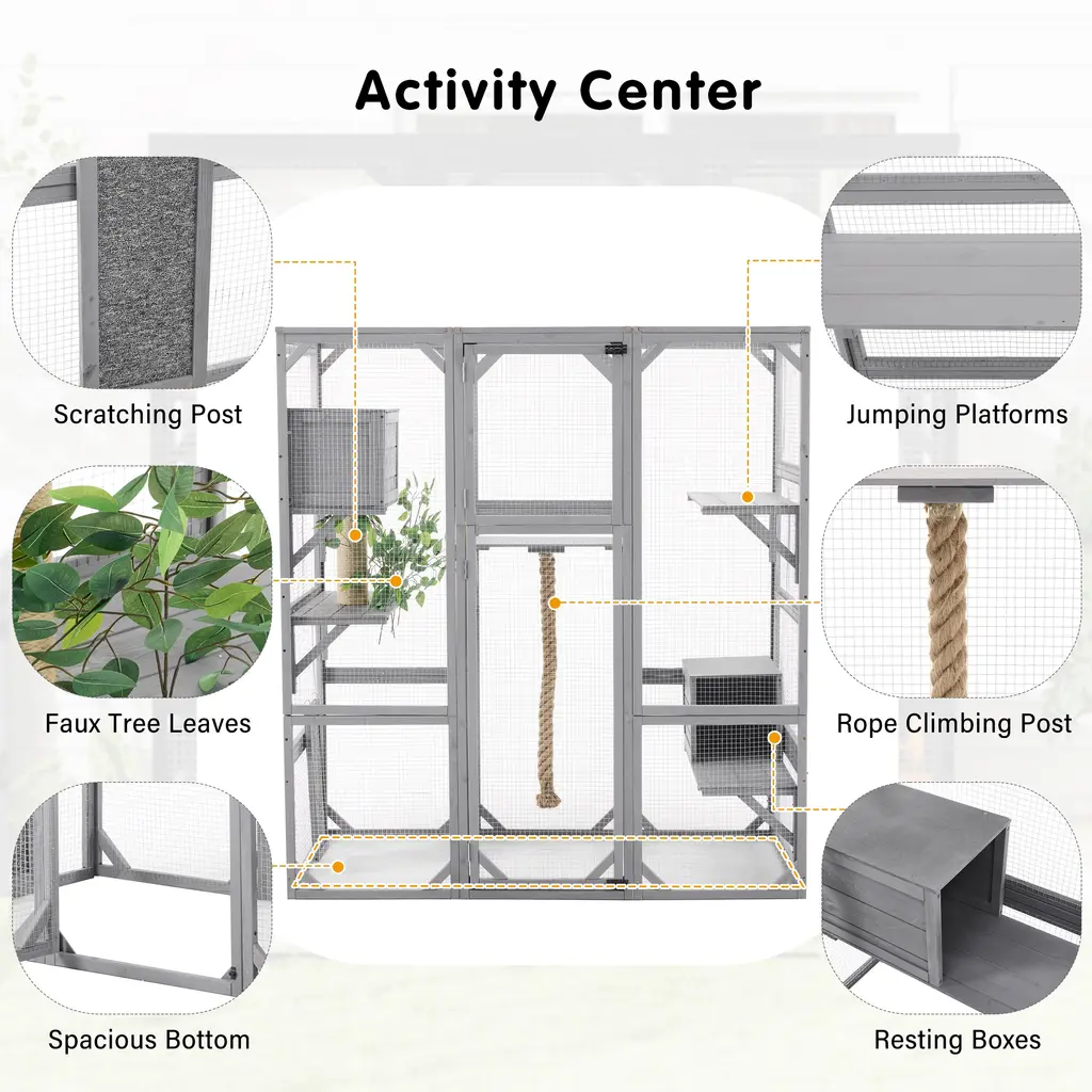 Product OverviewCreate a secure and enriching outdoor retreat for your feline friends with this spacious walk-in cat enclosure. Designed to support your cat’s natural behaviors, it features multiple elevated platforms, cozy sleep houses, a rope climbing post, and a sturdy scratching post. Crafted from high-quality pine wood and reinforced with galvanized wire mesh, this catio provides safety, durability, and comfort. Faux tree leaves add a natural touch, while the double-door walk-in design makes feeding, cleaning, and bonding effortless.Product FeaturesSpecificationsSuitable ScenariosPerfect for cat lovers with patios, backyards, balconies, or gardens, this enclosure offers a secure outdoor experience for indoor cats. Ideal for homes with multiple cats or those seeking to enrich their pets’ environment while keeping them safe from outdoor dangers.Notes