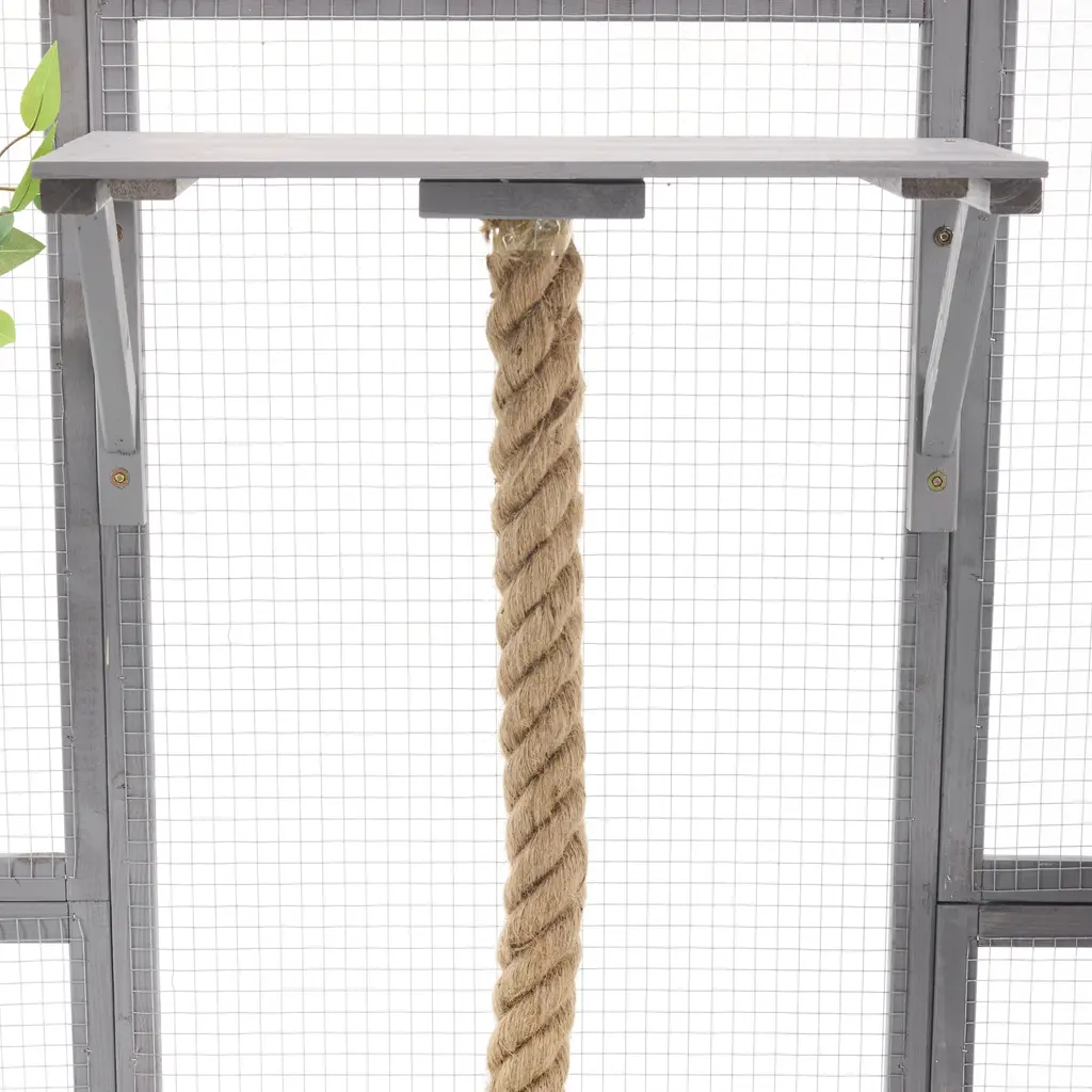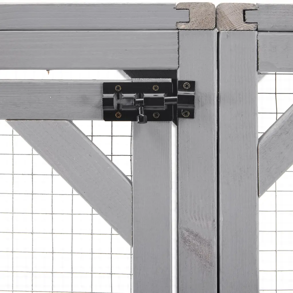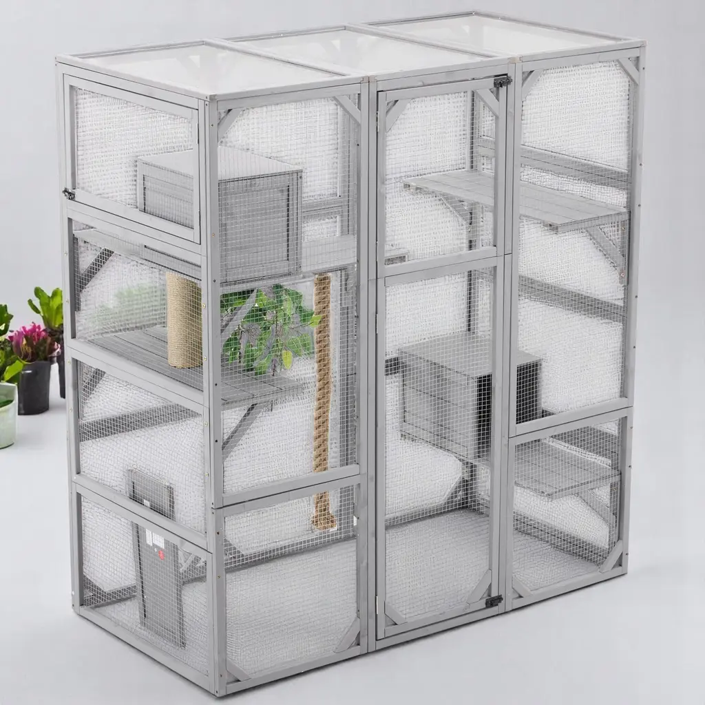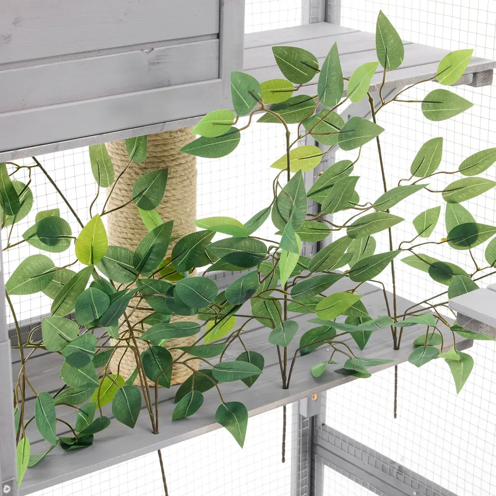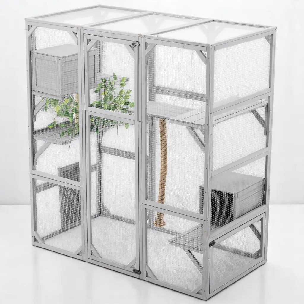 Product OverviewCreate a secure and enriching outdoor retreat for your feline friends with this spacious walk-in cat enclosure. Designed to support your cat’s natural behaviors, it features multiple elevated platforms, cozy sleep houses, a rope climbing post, and a sturdy scratching post. Crafted from high-quality pine wood and reinforced with galvanized wire mesh, this catio provides safety, durability, and comfort. Faux tree leaves add a natural touch, while the double-door walk-in design makes feeding, cleaning, and bonding effortless.Product FeaturesSpecificationsSuitable ScenariosPerfect for cat lovers with patios, backyards, balconies, or gardens, this enclosure offers a secure outdoor experience for indoor cats. Ideal for homes with multiple cats or those seeking to enrich their pets’ environment while keeping them safe from outdoor dangers.Notes