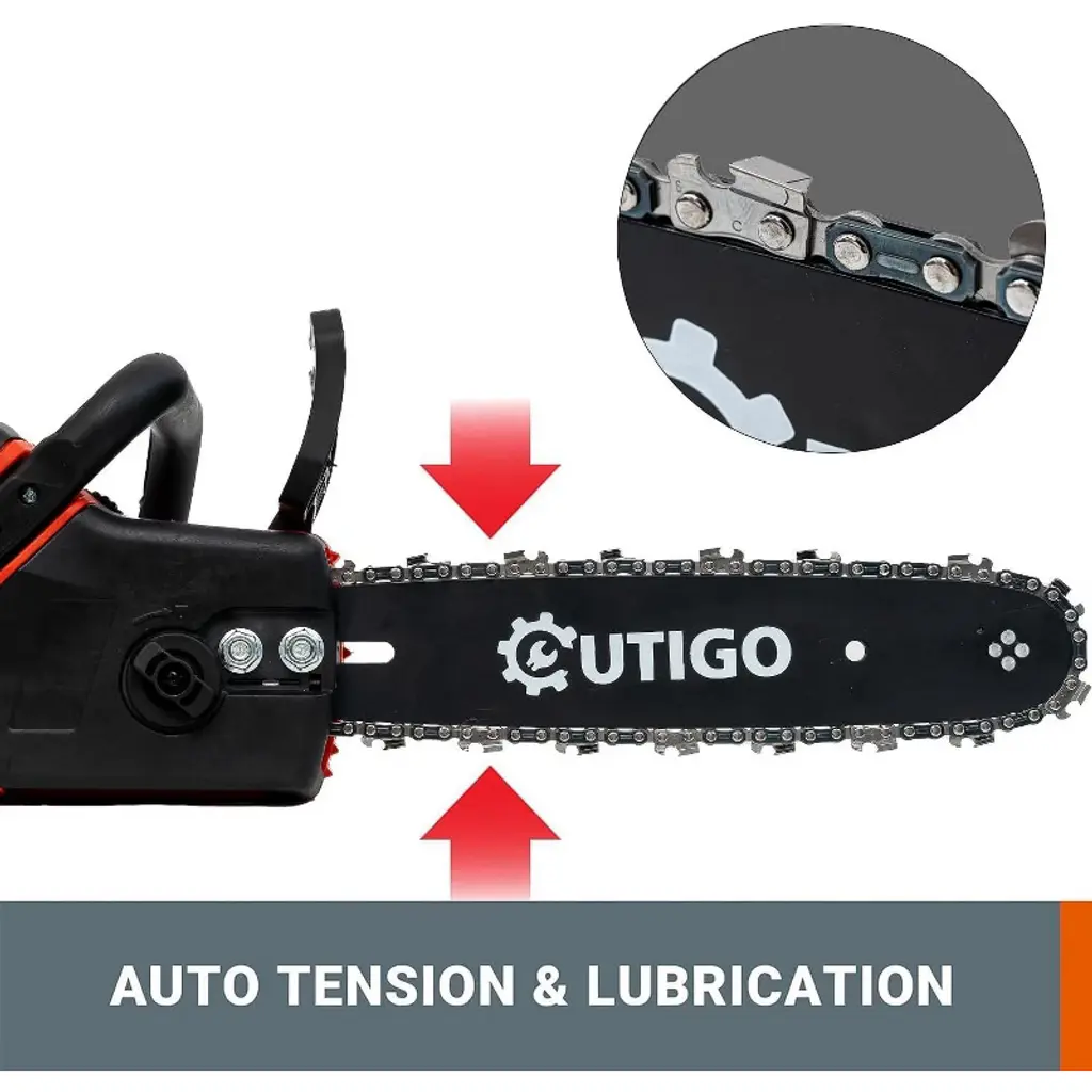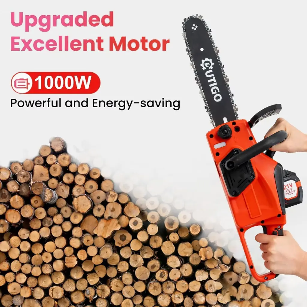 Outigo Cordless Electric Chainsaw, 1000w Brushless Chainsaw 12-inch, 2 Replacement Chains & 1 Guide Bars & Charger