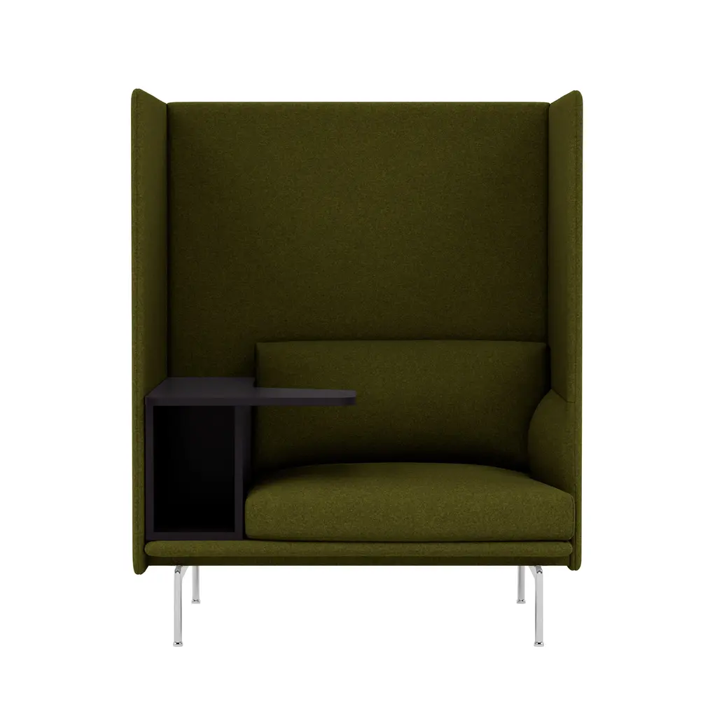 Providing acoustic and spatial shelter, Muuto’s refined Outline series adds Highback Work, combining expansive seated comfort with a desk surface-storage cubby on a trim base. Options include left or right orientation and a cable outlet for easy power access, making the chair a complete task-oriented environment for open-plan offices or hospitality settings.