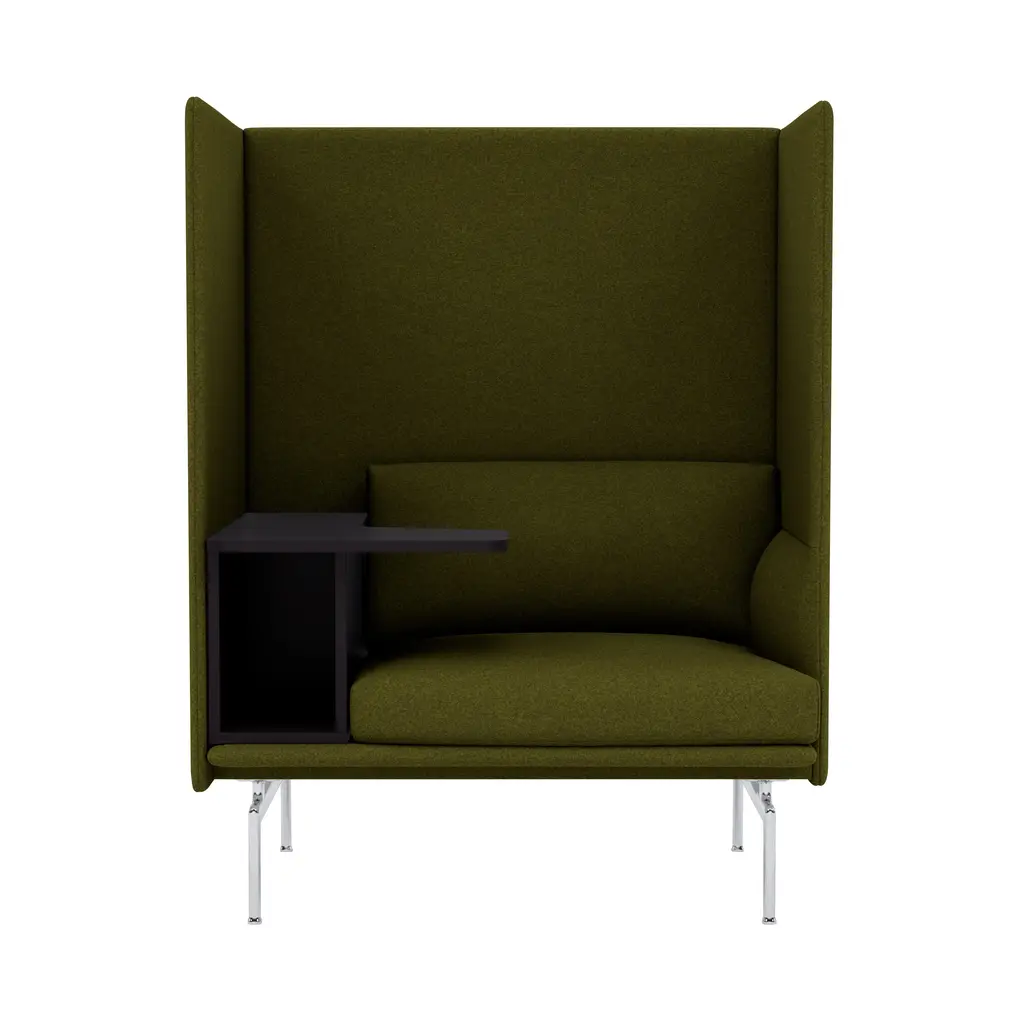 Providing acoustic and spatial shelter, Muuto’s refined Outline series adds Highback Work, combining expansive seated comfort with a desk surface-storage cubby on a trim base. Options include left or right orientation and a cable outlet for easy power access, making the chair a complete task-oriented environment for open-plan offices or hospitality settings.
