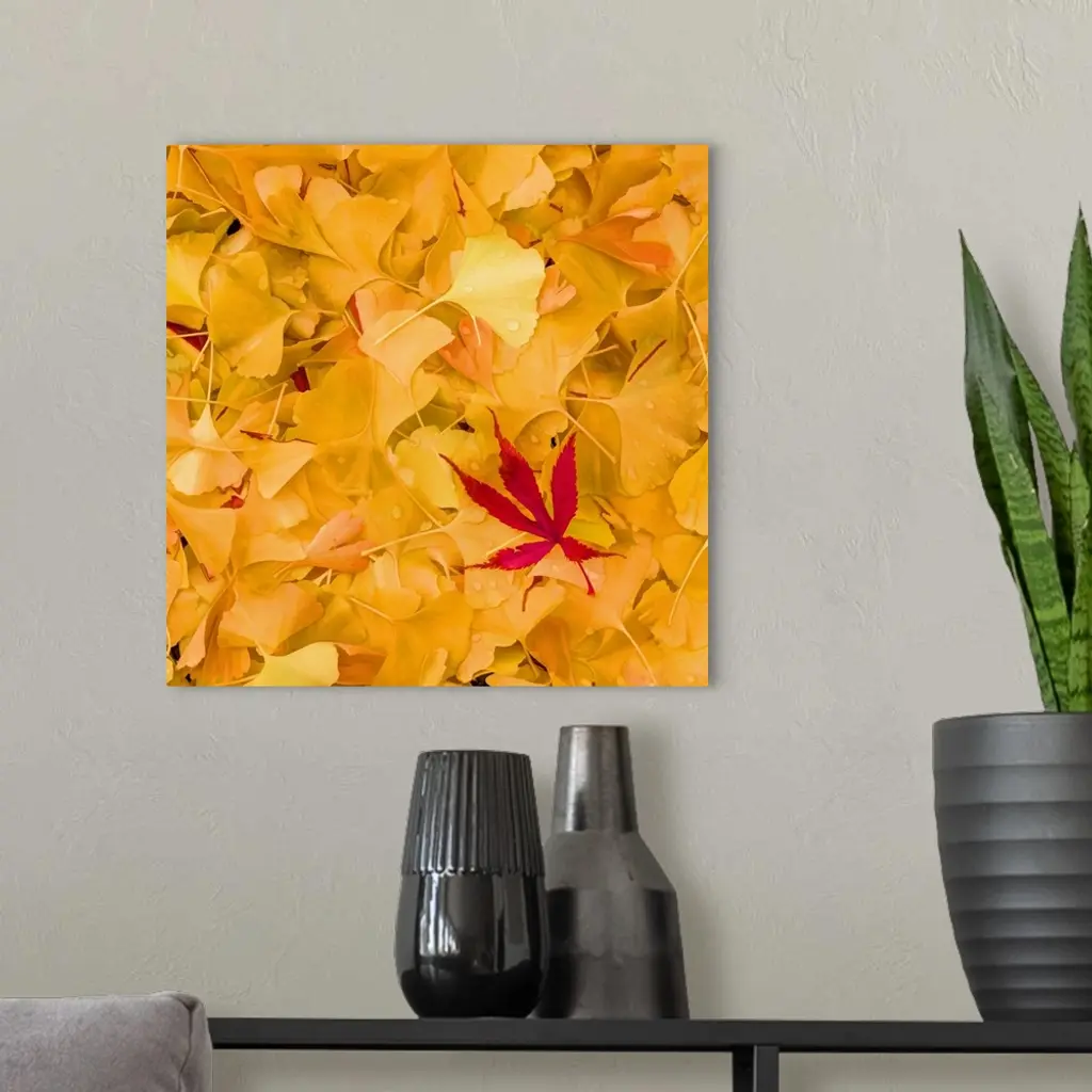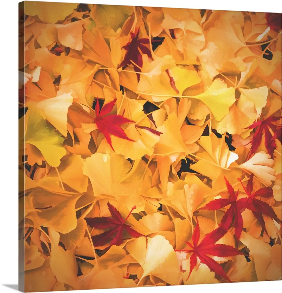 A group of red maple and yellow gingko leaves on the ground.