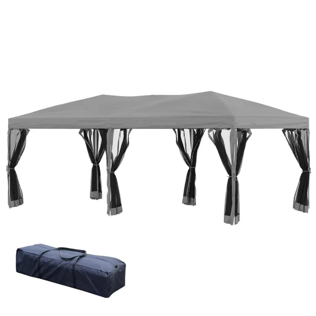 Grab your favorite drink and enjoy the shade of fun with this large pop up gazebo tent 10' x 20' from Outsunny. This easy up canopy is perfect for any occasion outside, such as family gatherings, picnics, camping. You can easily and quickly assemble or take down the portable gazebo with no hassle, thanks largely to the pivoting joints of the frame. The mesh sidewalls of the outdoor canopy tent make it great providing some privacy, so you can enjoy the outdoors.