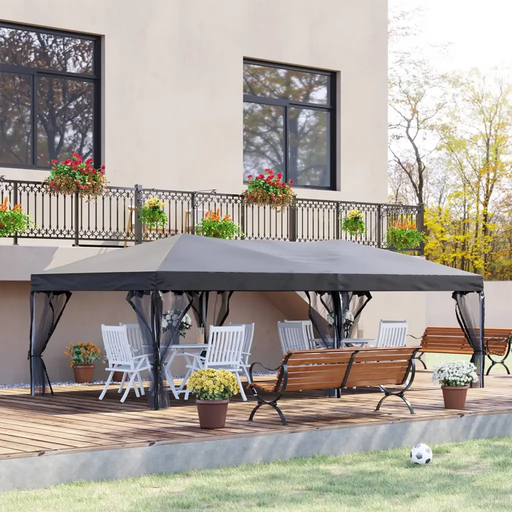 Grab your favorite drink and enjoy the shade of fun with this large pop up gazebo tent 10' x 20' from Outsunny. This easy up canopy is perfect for any occasion outside, such as family gatherings, picnics, camping. You can easily and quickly assemble or take down the portable gazebo with no hassle, thanks largely to the pivoting joints of the frame. The mesh sidewalls of the outdoor canopy tent make it great providing some privacy, so you can enjoy the outdoors.