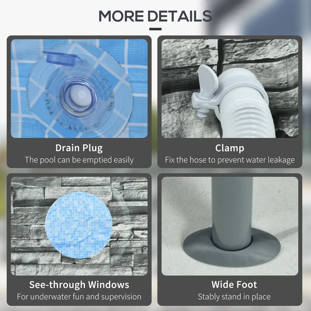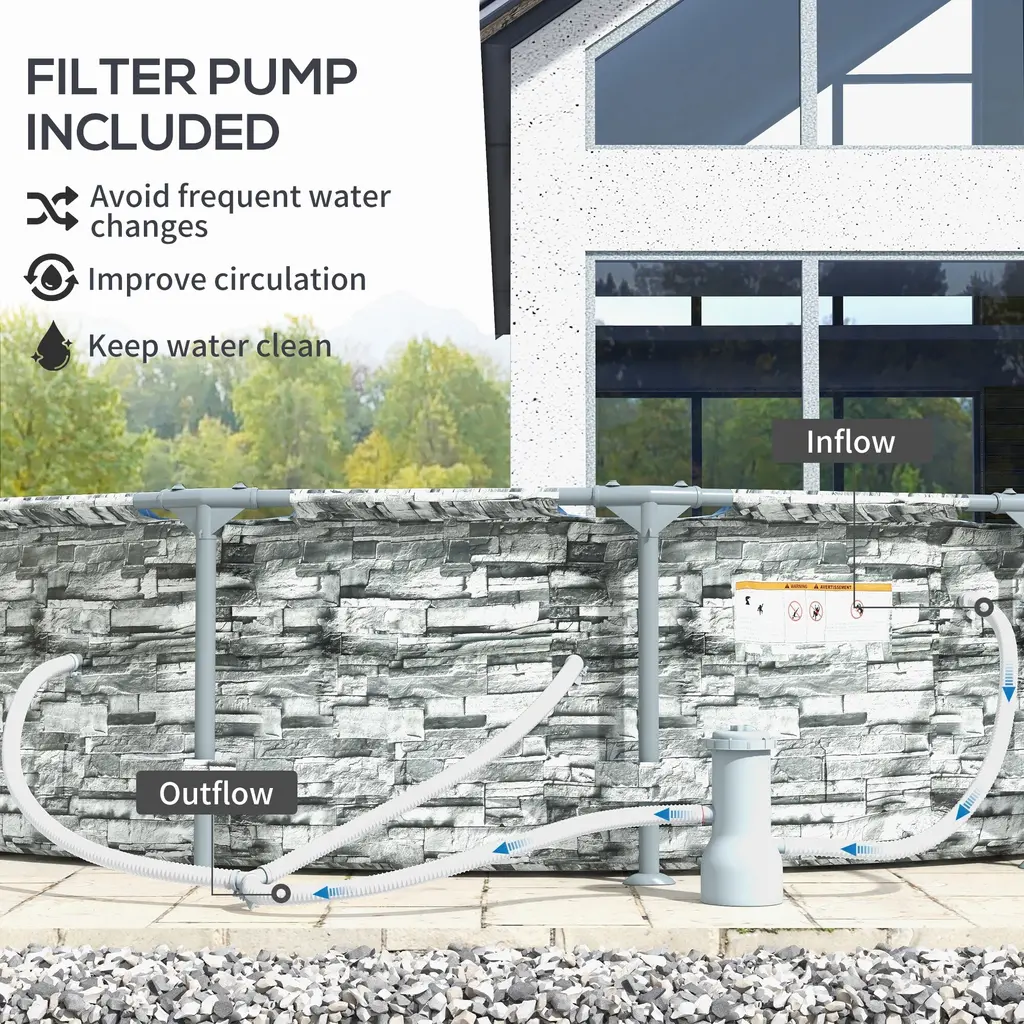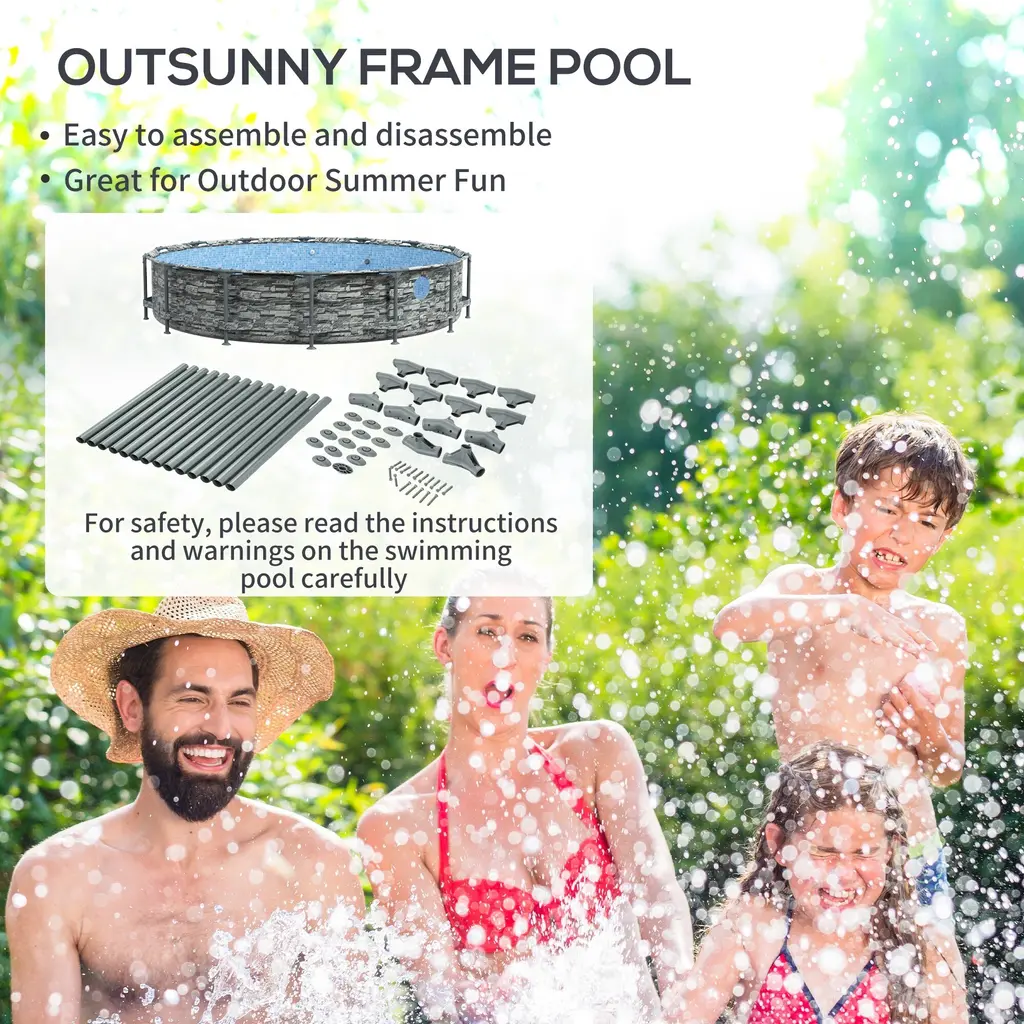 Descriptions:Make a splash this summer with an Outsunny above-ground pool. Call up some friends this large, 14' pool can hold up to 8 adults. A classic blue tile pattern on the inside brings the look of an in-ground without the wait. This is a self-cleaning pool featuring a filter pump to keep the water crystal clear and free from debris. With two transparent windows on the sides, you can see out from underwater and say hello. Have your own backyard Oasis with an Outsunny above-ground pool.Features:● Accommodates up to 8 people with a spacious 14' diameter● Classic blue tile look● Included filter pump that maintains water clarity and hygiene● Steel frame with a powder coating to endure water● Two see-through windows for underwater fun and supervision● Great for family gatherings and cooling off on hot days● Assemble requiredSpecification:- Color: Gray- Pattern: Brick- Materials: Vinyl, Steel, ABS, Polypropylene- Overall Dimensions: Dia. 168.1" x 33.1" H- Window Diameter: Dia. 10"- Filter Pump: 530 gal/h- Voltage: AC 110-120V / 60Hz- Power: 35W- Power Cable Length: 25' L- Item Label: 848-068V80GY- Important:1) The pool must be assembled on a smooth and level site without stones, gravel, sticks, hardy grasses, etc.2) Do not drag the liner across the ground, as this can cause damage and pool leakage.