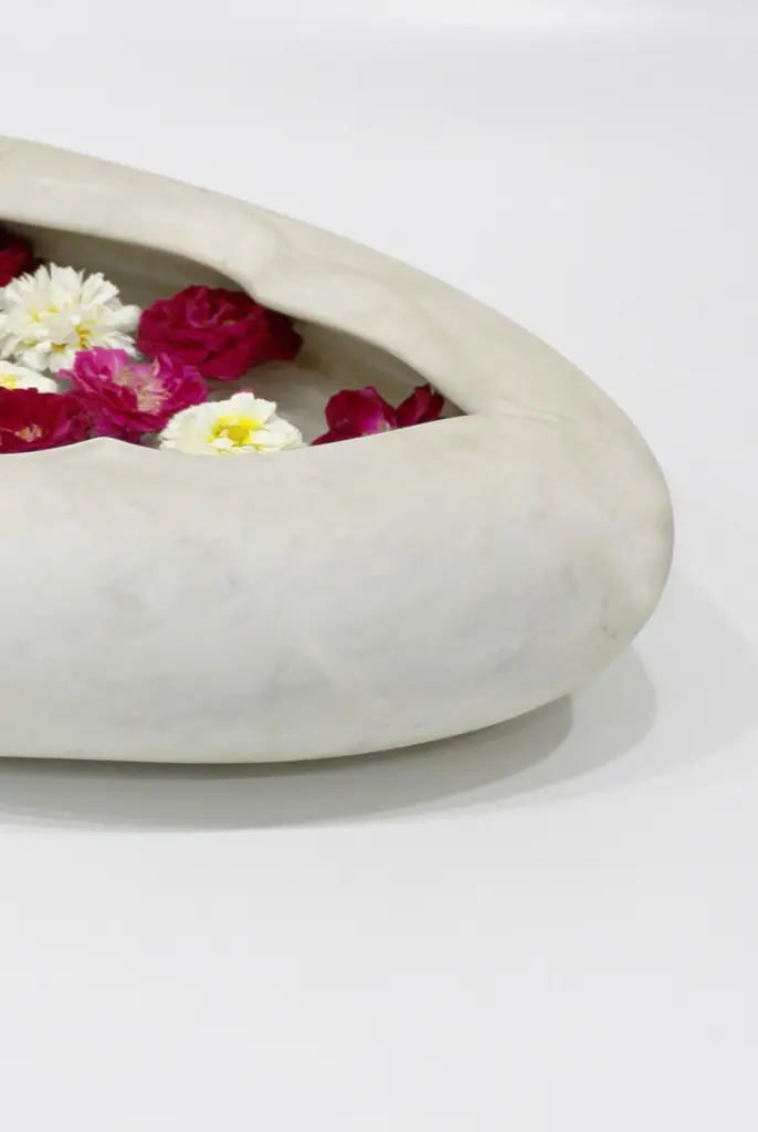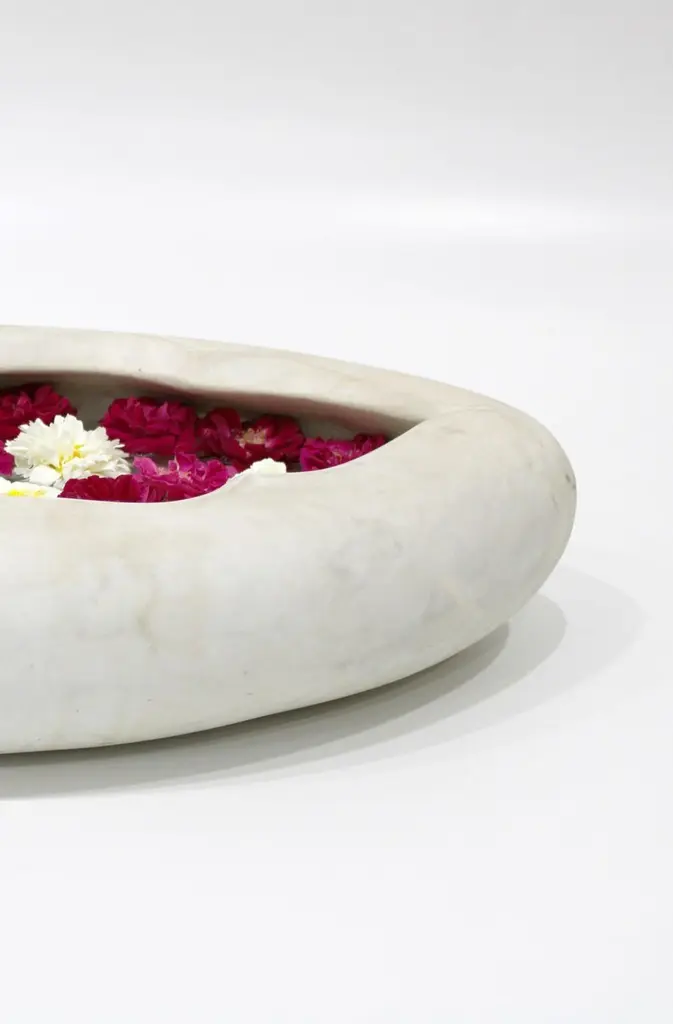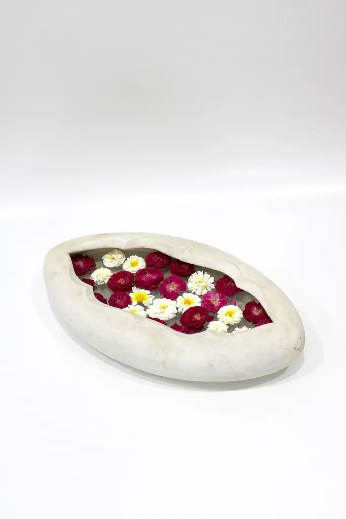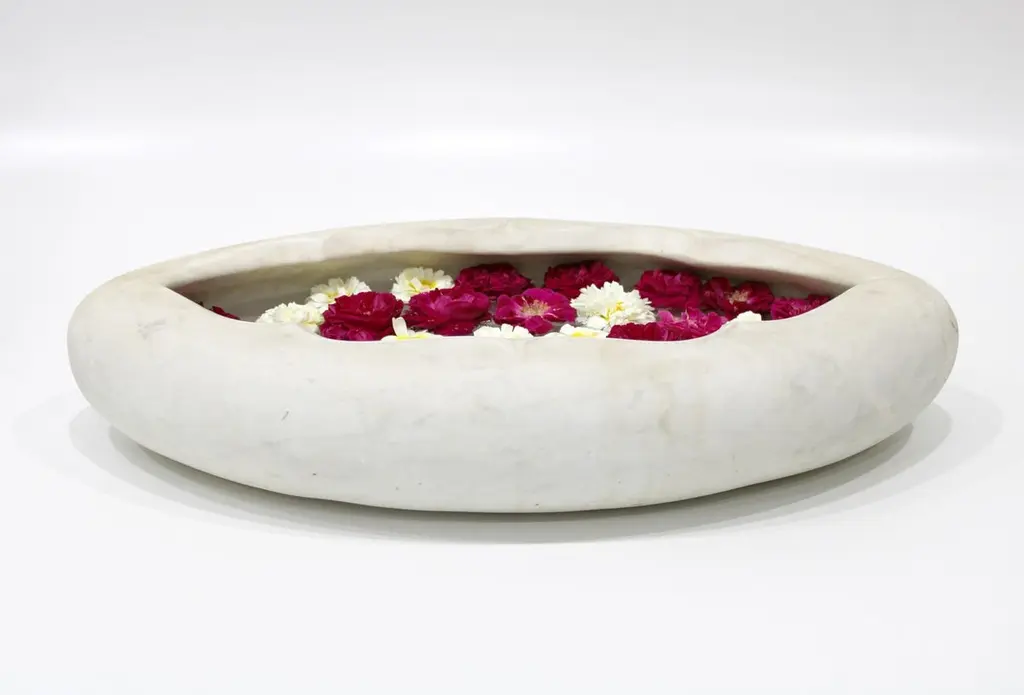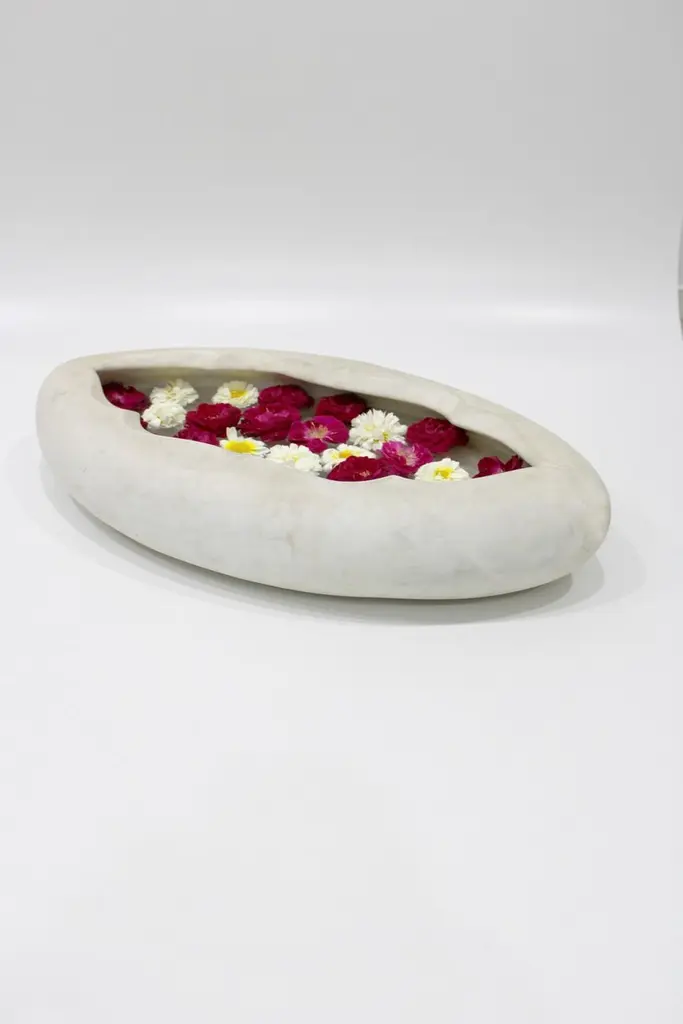 Inspired by the traditional Ajna Chakra motif found depicting the third eye in the ancient Indian Tantric scriptures, this bowl is hand carved from a single block of stone. A perfect addition to your meditation zone, yoga room, for potpourri or just a catch to throw in your keys.Oval Pot in White Marble Size- 26"x15"x06"HMaterials - White Marble, Hand-CraftedBuyer Cancellation-The cancellation charge is 25% which increases to 50% if the production is started.Prices do not include shipping from India (for custom orders) or our MN warehouse (items from stock). That will be additional.