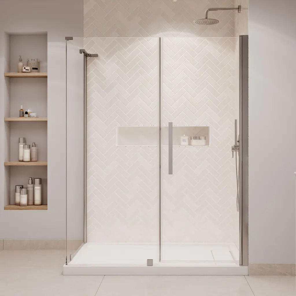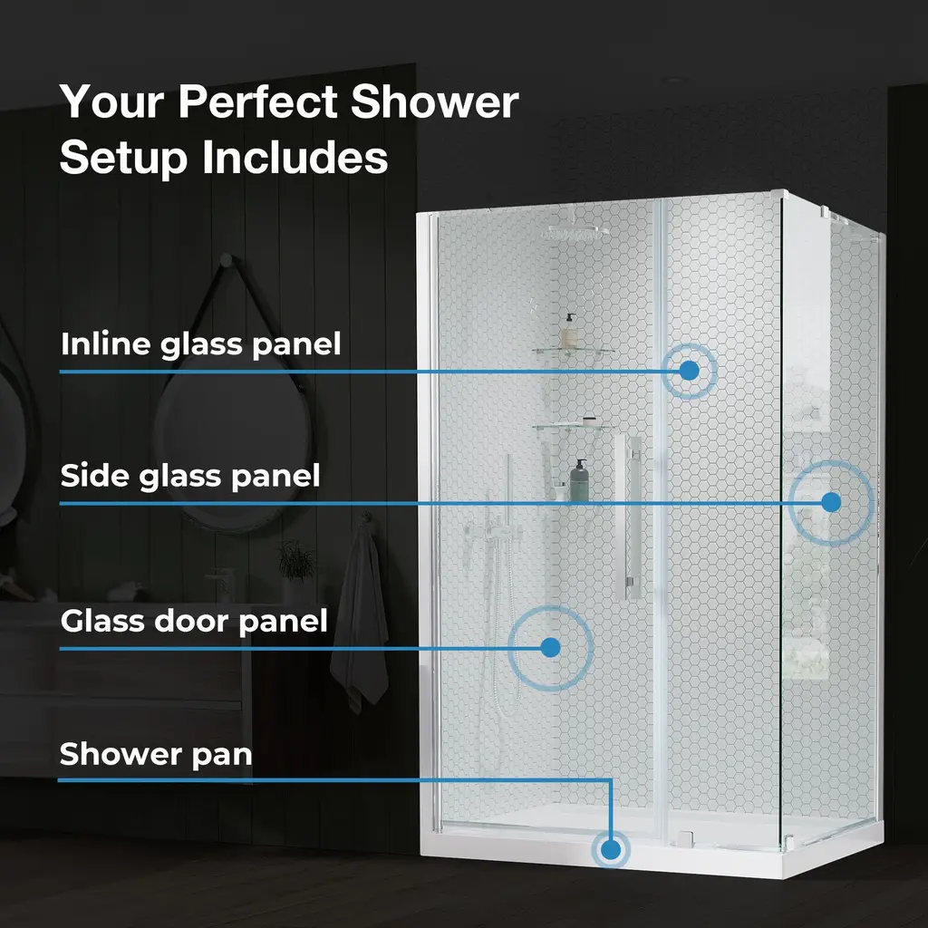 The Ove Decors Pasadena 60 in. frameless pivot shower door kit offers the kind of sophisticated enclosure design that complements any and all bathroom styles. It has a full-length door-to-wall pivot door mechanism, with premium quality hardware, and includes a 25 in. wide door panel, a 29 in. wide inline panel, a 33 in. wide side panel, and a 60 in. x 36 in. x 2 3/4 in. shower base, ideal for a corner installation. All glass door panels are made from premium 8mm (5/16") thick certified tempered glass and feature high quality magnetic door strips and engineered hardware that ensure smooth opening and closing and no leaks. The reversible shower pan has a subtle covered side drain design, is made of premium fiberglass-reinforced acrylic and has a slip-minimizing textured surface and easy-to-clean construction.Ove Decors 15SKS-PASA60 Features:Ove Decors 15SKS-PASA60 Specifications: