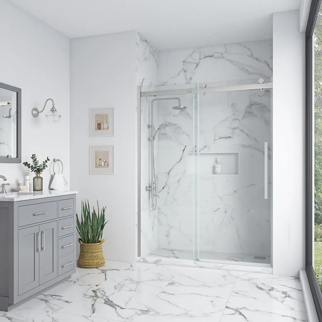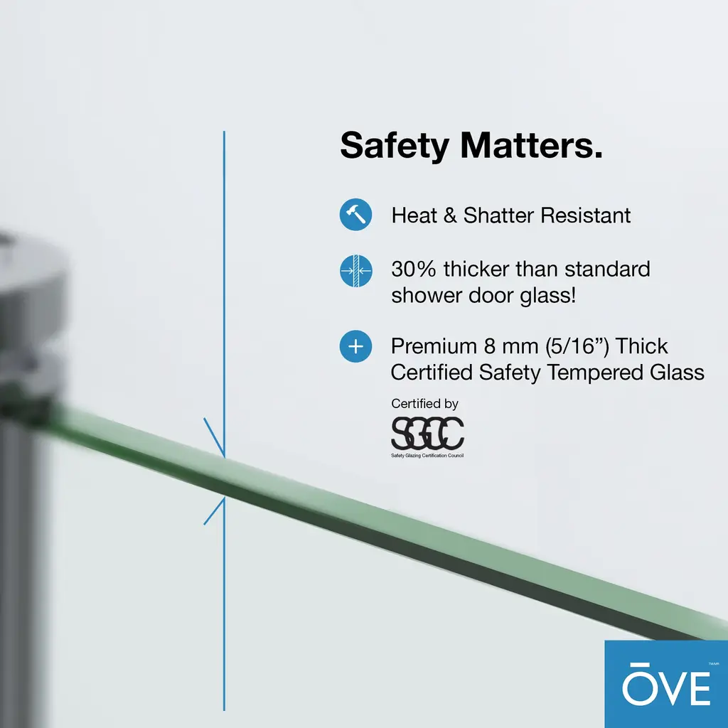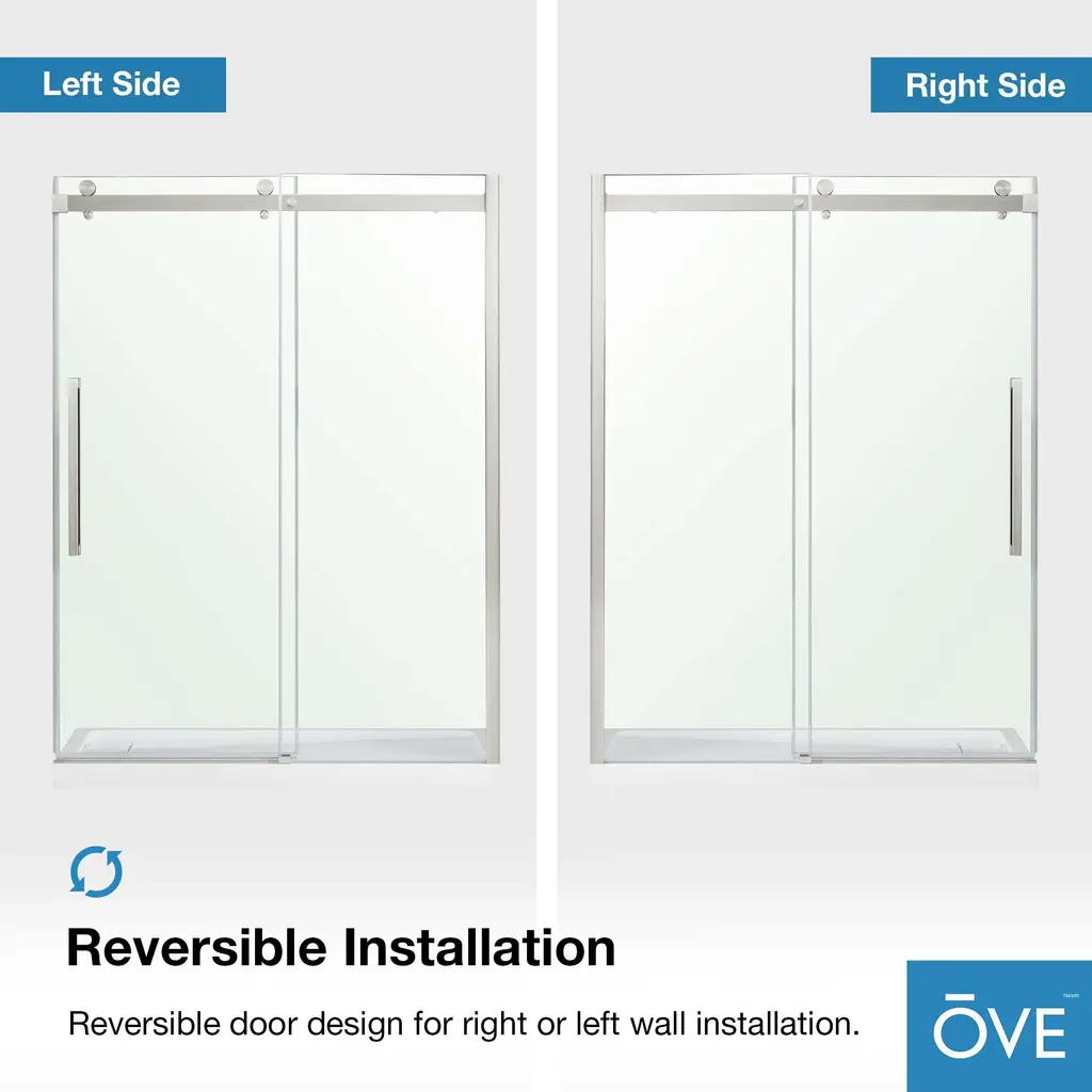Bring an extra touch of luxury to your bathroom design with the Bel Soft-Close 48-in sliding alcove shower doors by OVE Decors. The rectangular shape of the frameless shower enclosure features oversized vertical bar handles, dramatic roller accents and clear high-end tempered glass panels, for a custom look and cool urban style. State of the art rolling mechanism hardware ensures an effortlessly smooth soft-close quiet door and watertight seal. The glass panels can be installed with right or left door opening, with built-in adjustability for out-of-plumb walls and easy to clean practicality. Enjoy Bel's beauty and solid built construction for years to come. Included matching hardware.