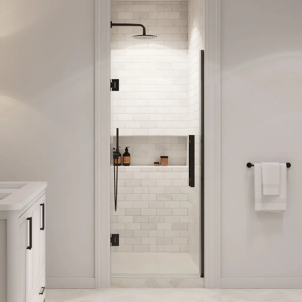 The Panama 30 11/16 in. frameless hinge shower door from OVE Decors has a modern, minimalist design that pairs high functionality with contemporary style. It comes with premium quality hardware, complete with a sleek black finish, and includes a 29 in. wide door panel, ideal for an alcove installation. The glass door panel is made from premium 8mm (5/16”) thick certified tempered glass, and features high quality magnetic door strips and engineered hardware that ensure smooth opening and closing and no leaks.