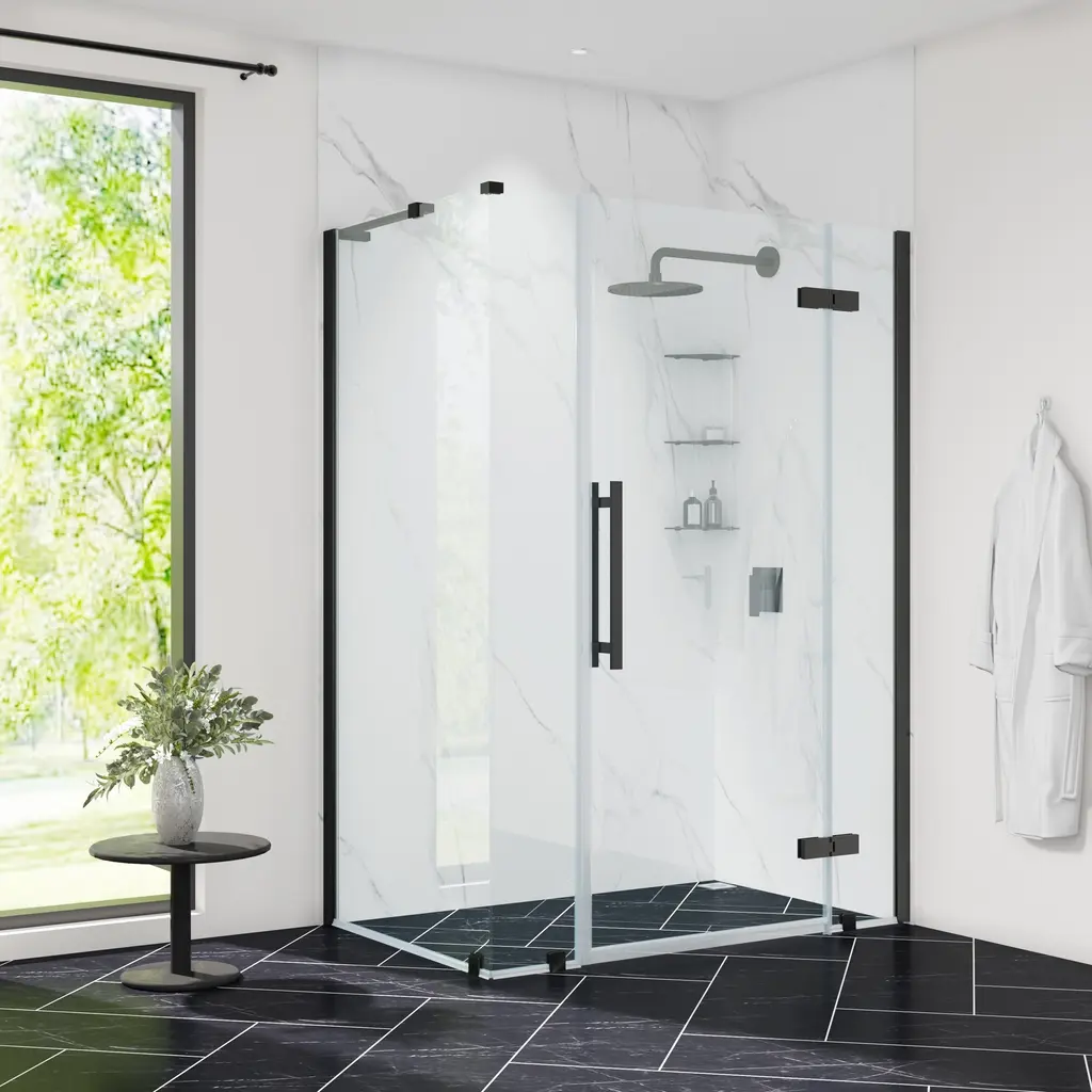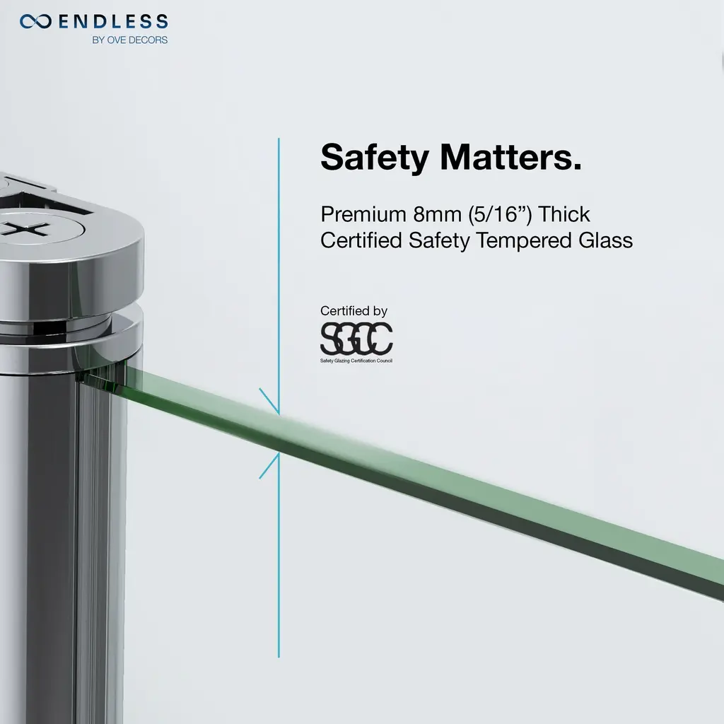 OVE Endless Tampa TA1312101, 41 5/8 to 42 13/16 in. W x 72 in. H Corner Frameless Hinge Shower Door with Shelves. The OVE Decors Endless 42 13/16 in. Tampa frameless hinge shower door set features a fixed panel hinge system, offering an industrial-inspired look that will complement any space. It comes with premium quality oversized hardware, and includes a 10 in. wide fixed panel, a 24 in. wide door panel, a 6 in. wide inline panel, a 31 in. wide side panel, ideal for a Corner installation. All panels are made from Premium 8mm (5/16”) thick certified tempered glass. Three corner shelves included. The convenient corner shelves make washing simple by keeping your products at arms length at all times.Ove Decors TA131201 Features:Ove Decors TA131201 Specifications: