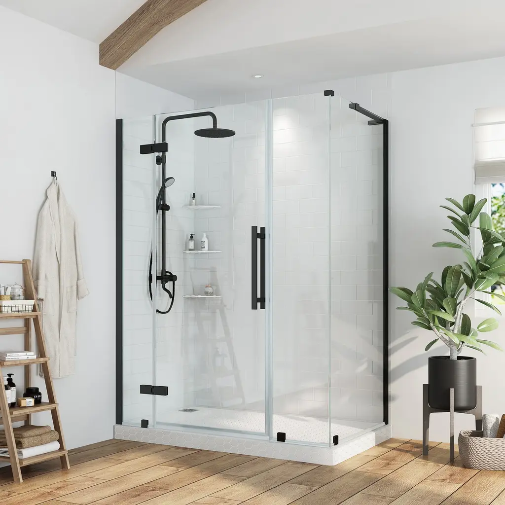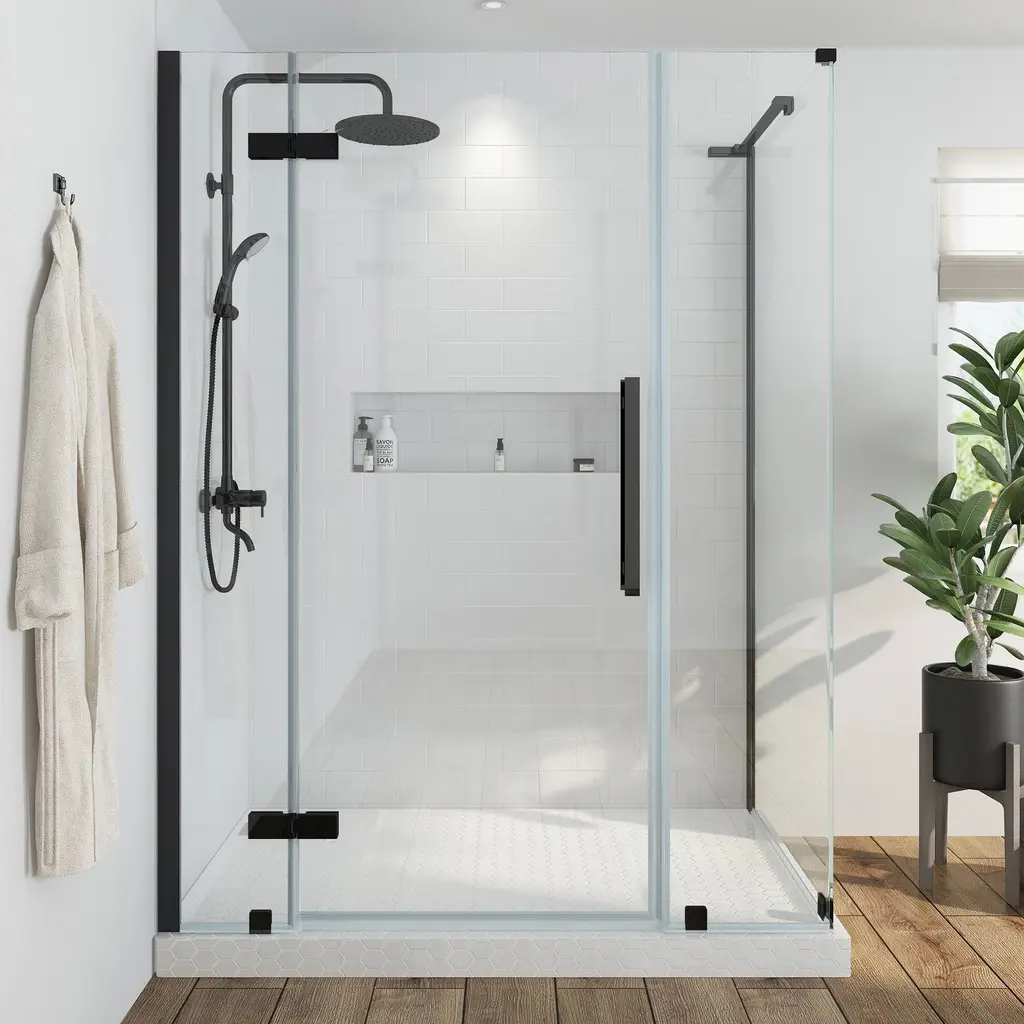 OVE Endless Tampa TA1351101, 49 5/8 to 50 13/16 in. W x 72 in. H Corner Frameless Hinge Shower Door with Shelves. The OVE Decors Endless 50 13/16 in. Tampa frameless hinge shower door set features a fixed panel hinge system, offering an industrial-inspired look that will complement any space. It comes with premium quality oversized hardware, and includes a 10 in. wide fixed panel, a 24 in. wide door panel, a 14 in. wide inline panel, a 29 in. wide side panel, ideal for a Corner installation. All panels are made from Premium 8mm (5/16”) thick certified tempered glass. Three corner shelves included. The convenient corner shelves make washing simple by keeping your products at arms length at all times.Ove Decors TA135101 Features:Ove Decors TA135101 Specifications: