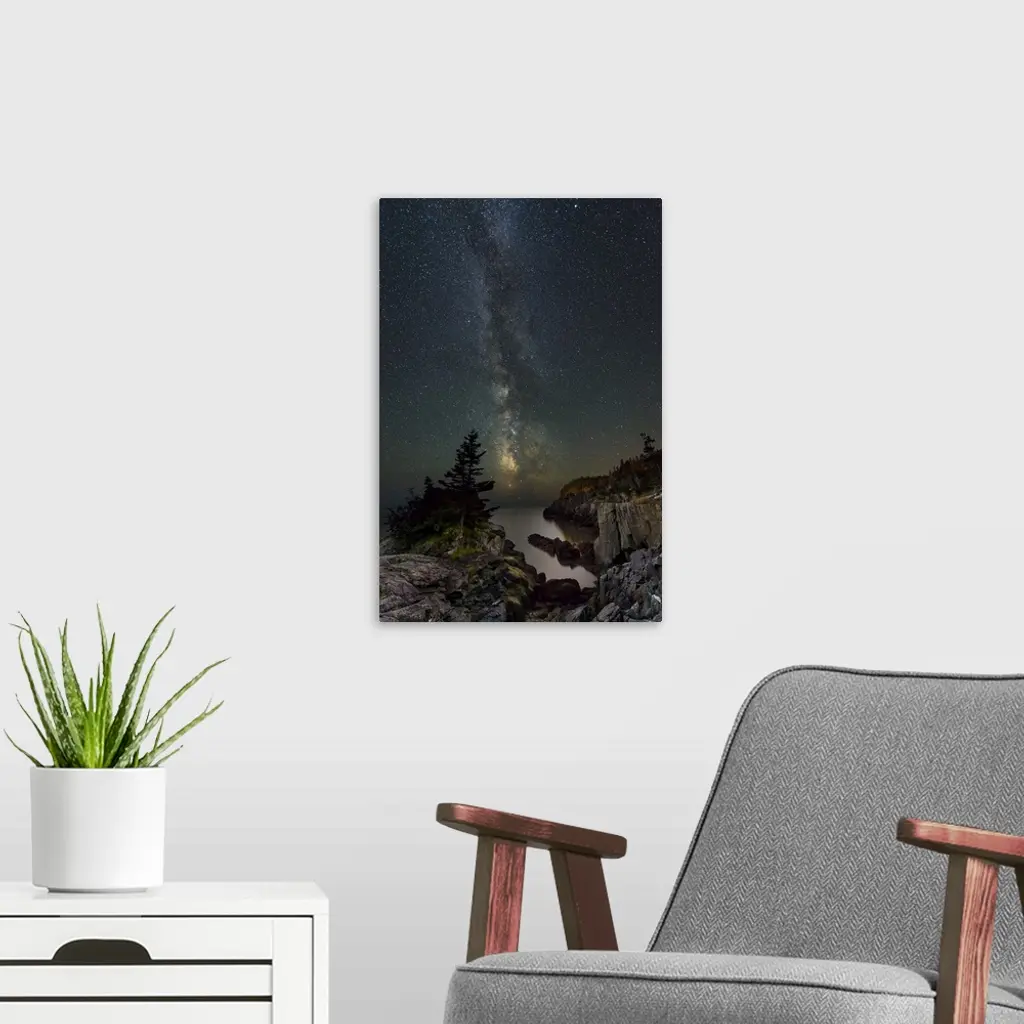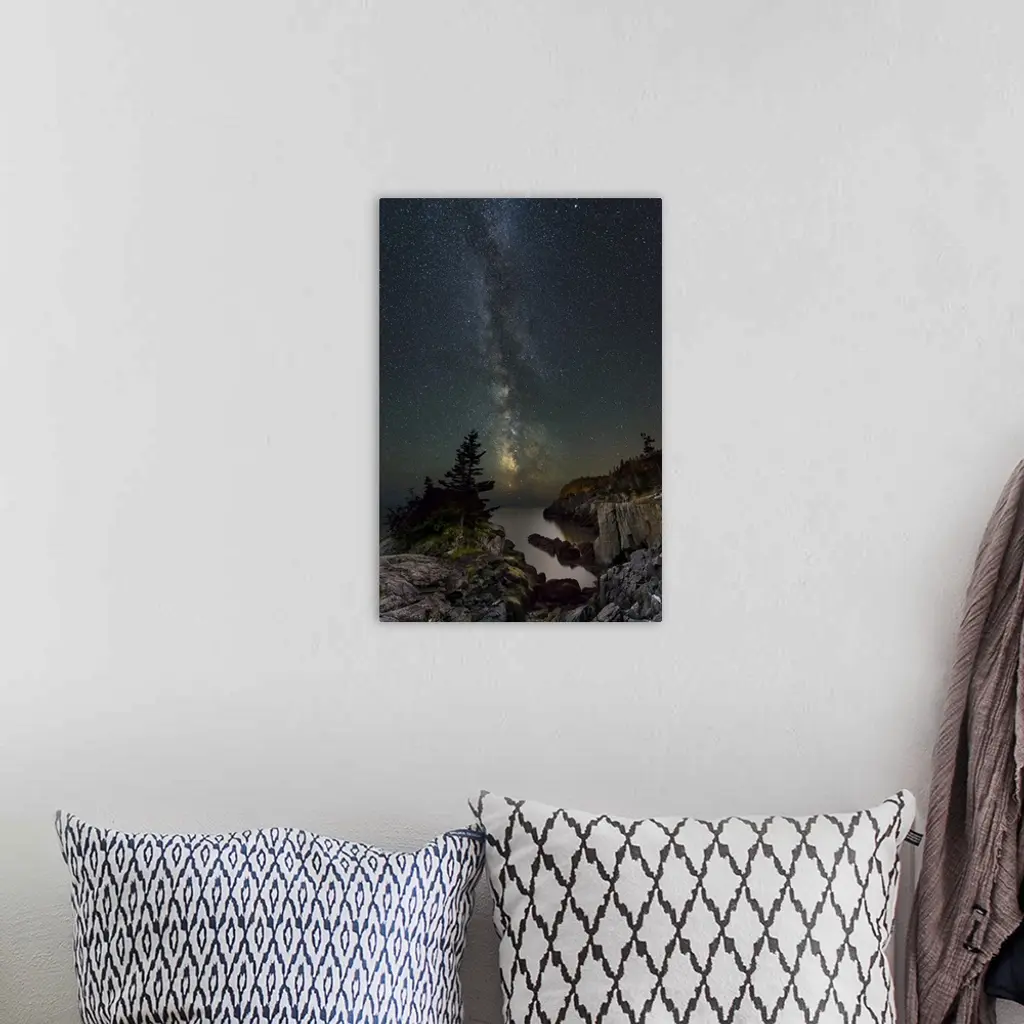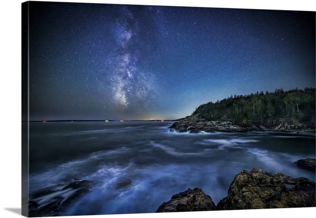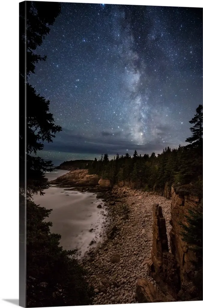 A photograph of a serene wilderness landscape under a night sky.