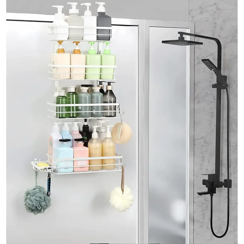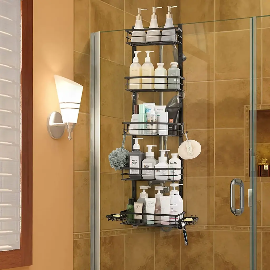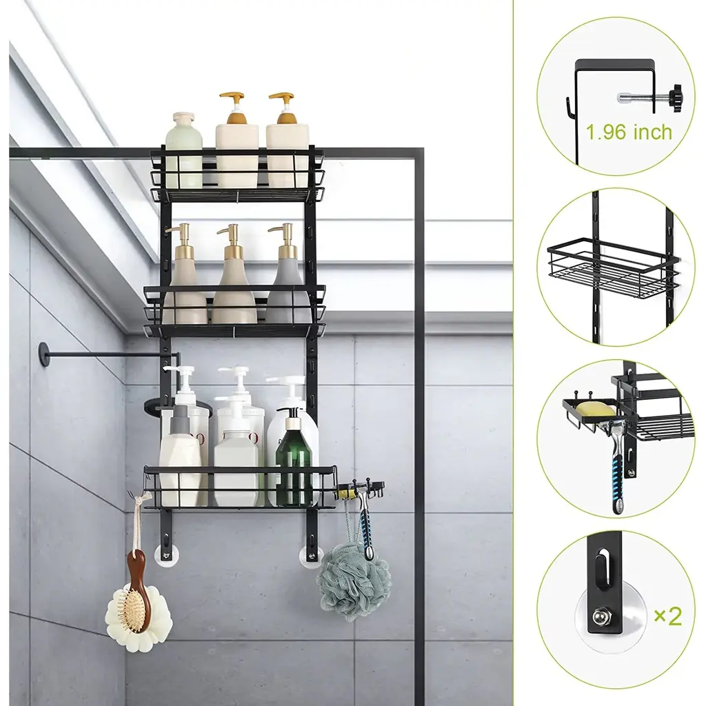 【Adjustable Height Shower Caddy】Over the door shower organizer with 3/4/5 height-adjustable large capacity shelves, you can adjust the distance between each shelf according to our needs and arrange smaller spaces for small toiletries, such as face creams, while it also has enough space for the highest shampoo and conditioner bottles. 【Adjustable Screw and Suction Cup Fixing Shower Organizer】Shower Shelf for inside shower top hook is fixed with screws to prevent it from sliding on the glass door, and it can also be adjusted to match door width to 2.55", you won't need to worry when using it will shake and cause a mess, the screws are installed with plastic pads that won't scratch the glass door. shower caddy hanging bottom uses suction cups to hold the shower rack in place and secure the shelf tightly to the shower door. 【Over the Door Shower Organizer WithAmple Storage Space】 Whether you need to store shampoo, conditioner, body wash, or other bathroom essentials, our hanging shower organizer has plenty of space for all your items. We give you an additional removable soap holder with hooks. You can hang razor, shower sponge and brush that provide an extra convenience, you don't need to buy extra soap holder. 【Rustproof & Fast Draining】The waterproof Bathroom Shower Shelf Organizer is not only rust-proof but also long-lasting in wet environments. Hollow and open bottom wire design helps water dry quickly and keeps bath essentials clean.NOTICE: NOT for sliding doors. 【Stable & Easy Assembly】Our shower caddy can be installed in minutes without drilling or other tools.
