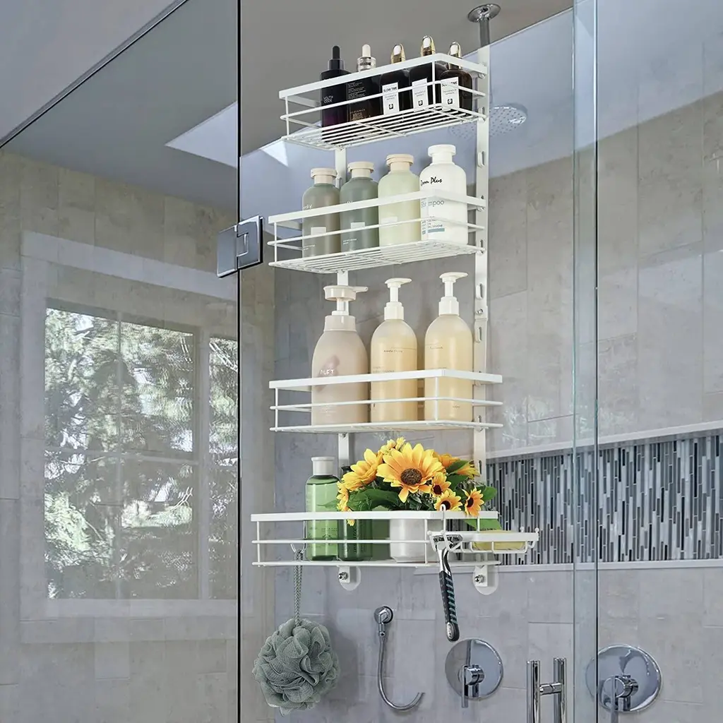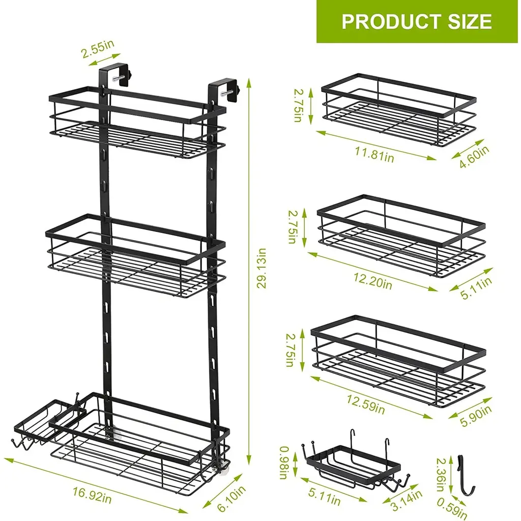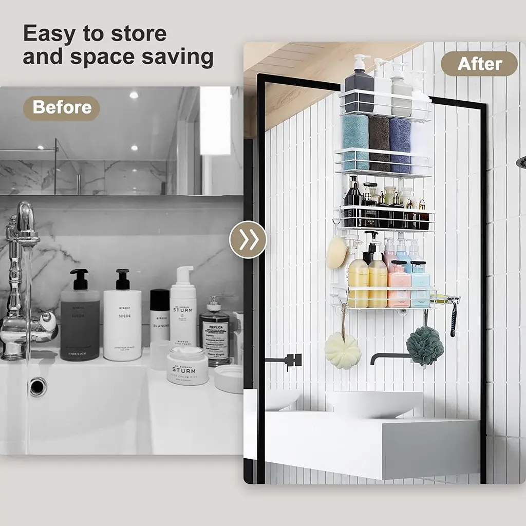 【Adjustable Height Shower Caddy】Over the door shower organizer with 3/4/5 height-adjustable large capacity shelves, you can adjust the distance between each shelf according to our needs and arrange smaller spaces for small toiletries, such as face creams, while it also has enough space for the highest shampoo and conditioner bottles. 【Adjustable Screw and Suction Cup Fixing Shower Organizer】Shower Shelf for inside shower top hook is fixed with screws to prevent it from sliding on the glass door, and it can also be adjusted to match door width to 2.55", you won't need to worry when using it will shake and cause a mess, the screws are installed with plastic pads that won't scratch the glass door. shower caddy hanging bottom uses suction cups to hold the shower rack in place and secure the shelf tightly to the shower door. 【Over the Door Shower Organizer WithAmple Storage Space】 Whether you need to store shampoo, conditioner, body wash, or other bathroom essentials, our hanging shower organizer has plenty of space for all your items. We give you an additional removable soap holder with hooks. You can hang razor, shower sponge and brush that provide an extra convenience, you don't need to buy extra soap holder. 【Rustproof & Fast Draining】The waterproof Bathroom Shower Shelf Organizer is not only rust-proof but also long-lasting in wet environments. Hollow and open bottom wire design helps water dry quickly and keeps bath essentials clean.NOTICE: NOT for sliding doors. 【Stable & Easy Assembly】Our shower caddy can be installed in minutes without drilling or other tools.