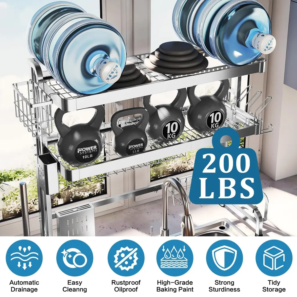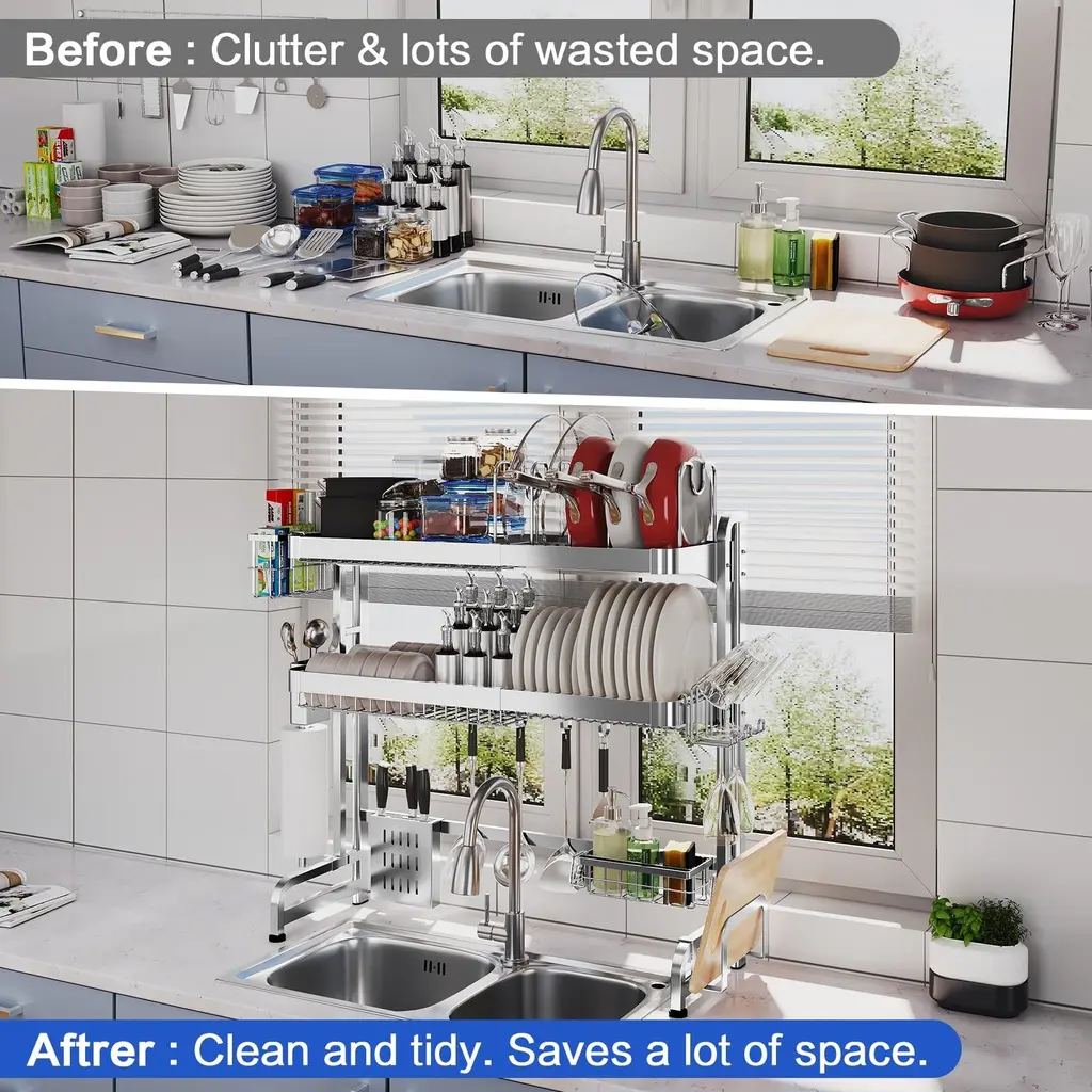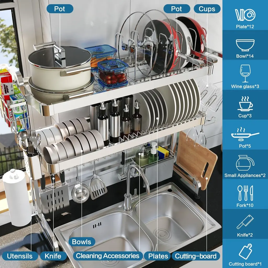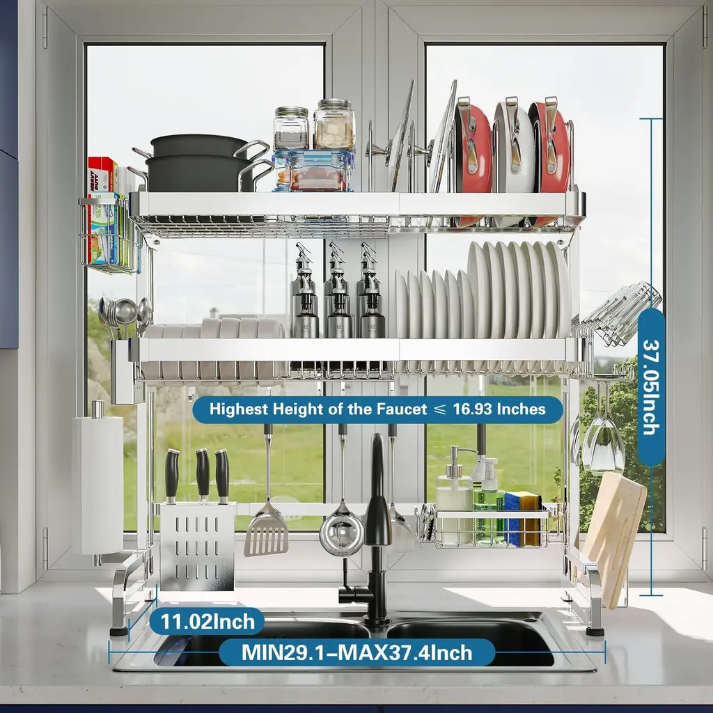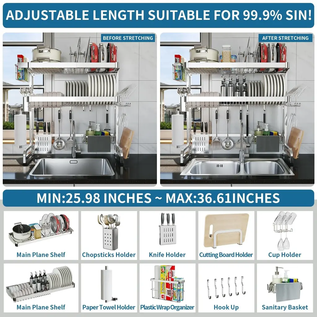 MULTIFUNCTIONAL DESIGN:This Large over sink dish rack features a multifunctional design that can meet your most needs for kitchen storage, it contains dish drying rack, pots and pans rack, cutting board holder, knife holder, utensil holder, cup holder, wrap holder, sink caddy, paper towel holder, 5 utility hooks and other functions in one, while the over-the-sink design enables it to drain water directly into the sink, not the countertop, it will be your great helper to keep your kitchen tiny. RUSTPROOF AND DURABLE: Made of premium stainless steel materials, over the sink drying rack is very durable and free of rust. The 3- tier dish rack over sink have passed a 24 hours salt test, you don't have to worry about the safety and health issue during the using. With a weight-bearing of up to 200lbs, it also saves your precious countertop space by making full use of the room over the sink. It is a real durable over sink dish drying rack stainless steel for a long term use. LARGE CAPACITY EXPANDABLE LENGTH: The size of the dish drying rack over the sink is adjustable, the Min width is 29.1" and Max width is 37.4", can meet both single and double sinks in your kitchen, 2 layers large shelves and a full range of accessories can help you storage a lot of kitchen items, it is great gift for both you and your kitchen-loving friends. SIMPLE ASSEMBLY & EASY CLEANING: It above sink dish drying rack is punched with accurate screw holes, and the screws and hex key come well kept in an extra bag, so you can easily assemble it with our user manual. All attachments can be easily detached to clean, wiping them with only a damp towel. Add to your cart now, then you will have a perfect over sink dish drainer for your kitchen. MEASURE THE SIZE BEFORE PURCHASE: It is important to accurately measure three values before your order: the width of the space where the kitchen sink is located, the height of the faucet, and the distance between the bottom of the cabinet and the countertop.