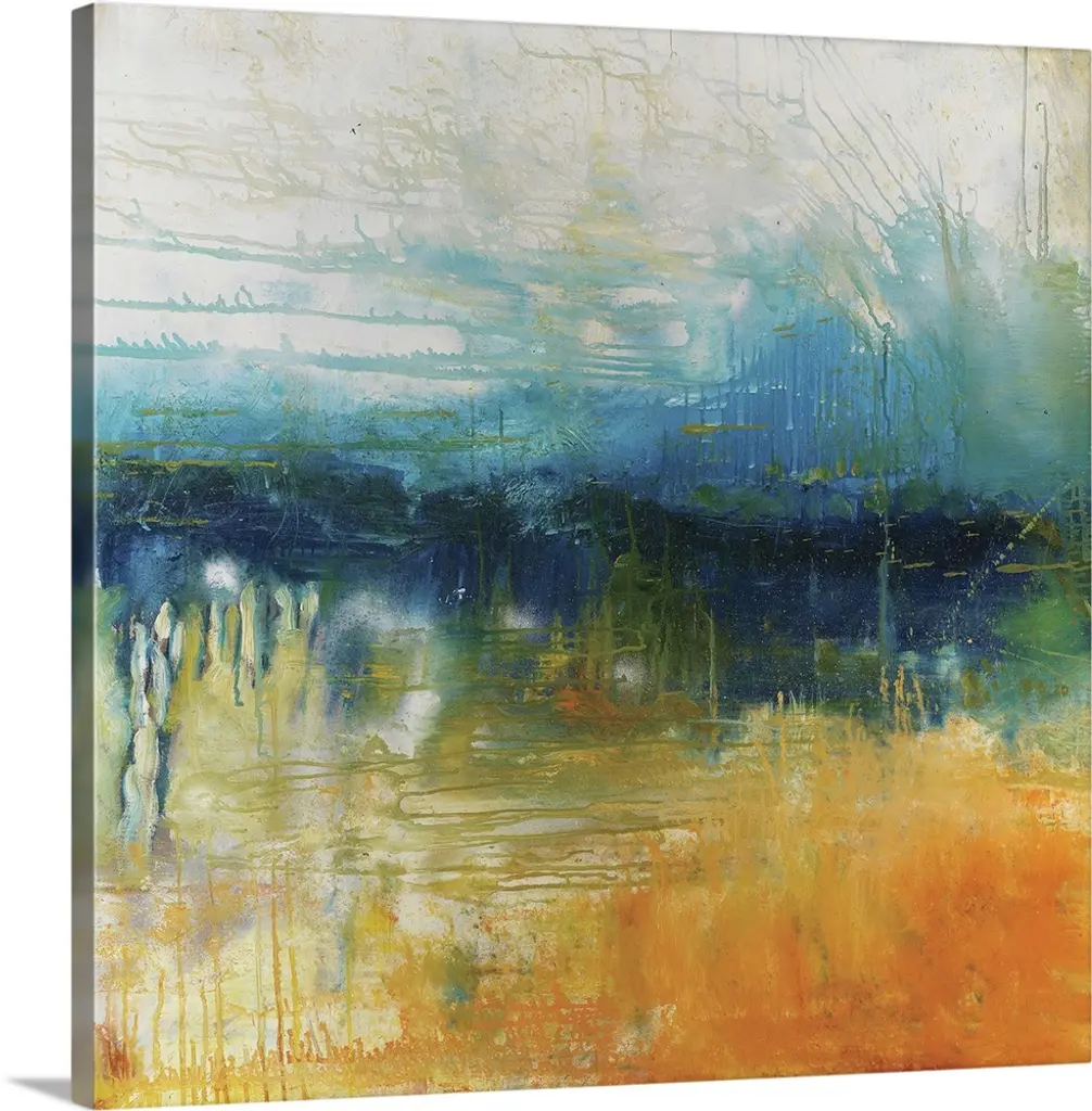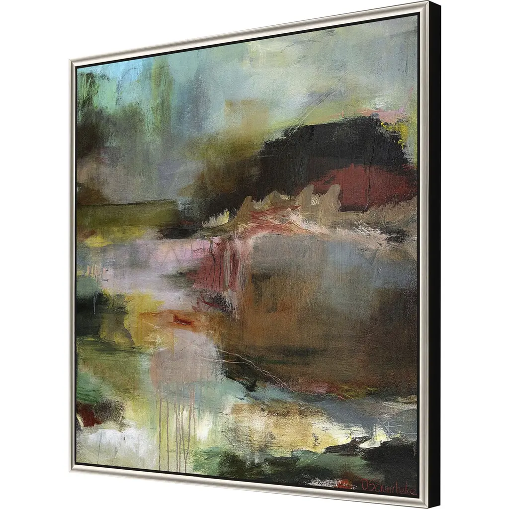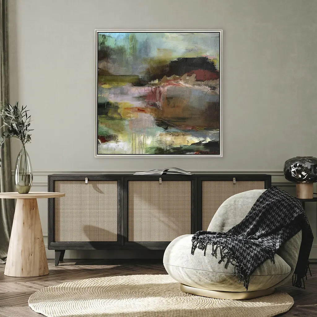 An abstract landscape dazzles in vivid colors. Canvas is mounted in a warm silver floater frame with satin black side.