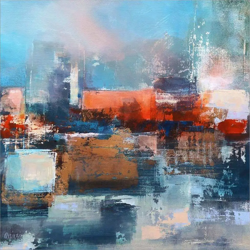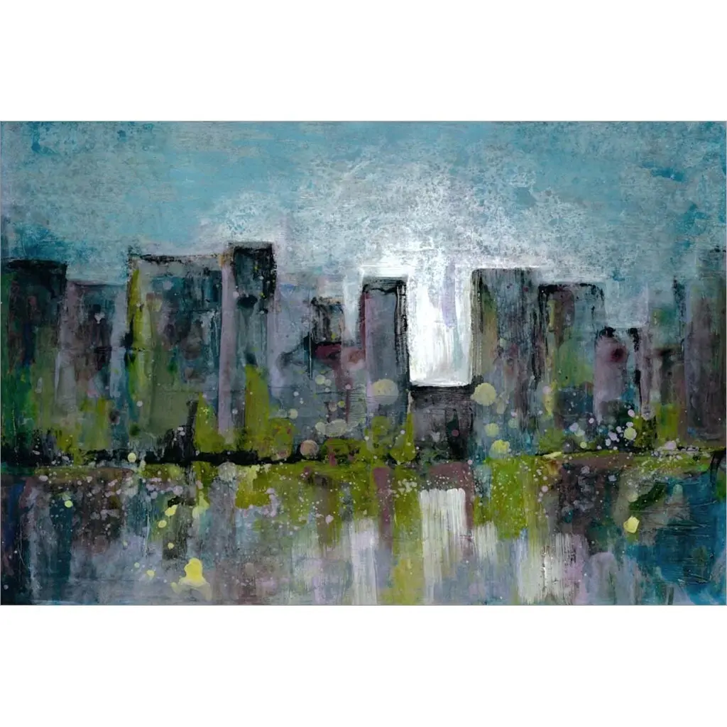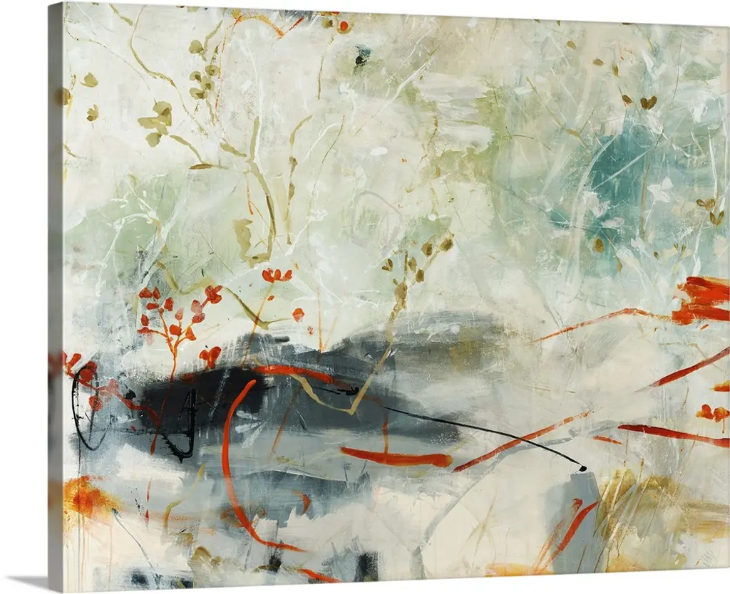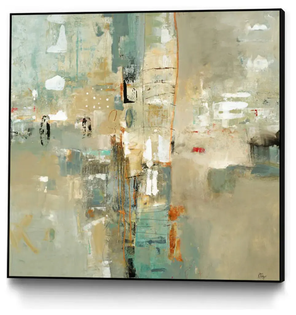 An abstract landscape dazzles in vivid colors. Canvas is mounted in a warm silver floater frame with satin black side.