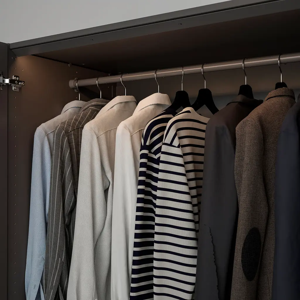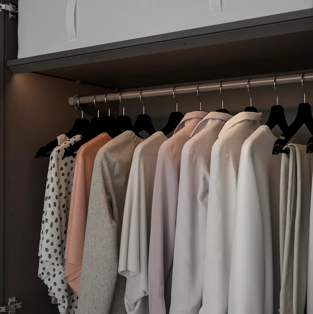 ÖVERSIDAN LED wardrobe lighting strp w sensor - dimmable dark gray 38 ". The light switches on and off automatically when you open or close the door so no energy is wasted. The LED light strip is available in 3 colors that match PAX wardrobe frames perfectly. Fits PAX wardrobe frames.