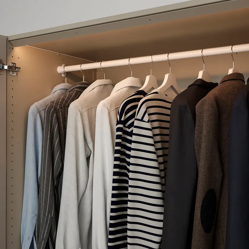 ÖVERSIDAN LED wardrobe lighting strp w sensor - dimmable gray-beige 38 ". The light switches on and off automatically when you open or close the door so no energy is wasted. The LED light strip is available in 3 colors that match PAX wardrobe frames perfectly. Fits PAX wardrobe frames.