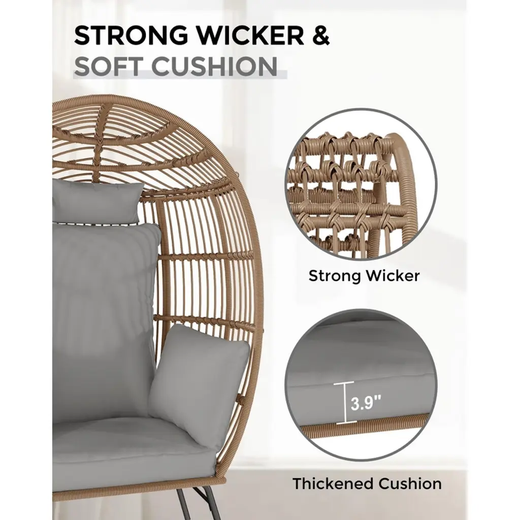 Experience ultimate relaxation with the Oversize Wicker Egg Chair with Ottoman, a perfect blend of comfort, durability, and style for your indoor and outdoor spaces. This egg-shaped lounge chair features a thick, high-quality cushion with a unique 3-sided design that provides exceptional support for your entire body, allowing you to unwind comfortably for hours.Built to last, the chair's robust rattan construction paired with a sturdy steel frame ensures it withstands various weather conditions including sun, rain, and temperature changes, making it ideal for your patio, porch, or backyard. The included matching ottoman not only offers plush leg support but also doubles as a convenient small table for your essentials.Designed with a modern aesthetic and natural rattan texture, this oversized egg chair adds a touch of elegance to any space, enhancing your outdoor or indoor décor effortlessly. Assembly is simple and quick with clear instructions and all necessary tools provided, allowing you to set up your new favorite lounge spot in about 30 minutes.- Thick, premium cushion with 3-sided design for full-body comfort and support- Durable rattan and steel frame construction for long-lasting outdoor use- Matching ottoman provides leg support and doubles as a small table- Stylish, modern design with natural rattan texture complements any décor- Easy assembly with clear instructions and included tools, ready in 30 minutesUpgrade your relaxation space with this versatile and stylish Oversize Wicker Egg Chair with Ottoman, perfect for enjoying leisure time in comfort and elegance.