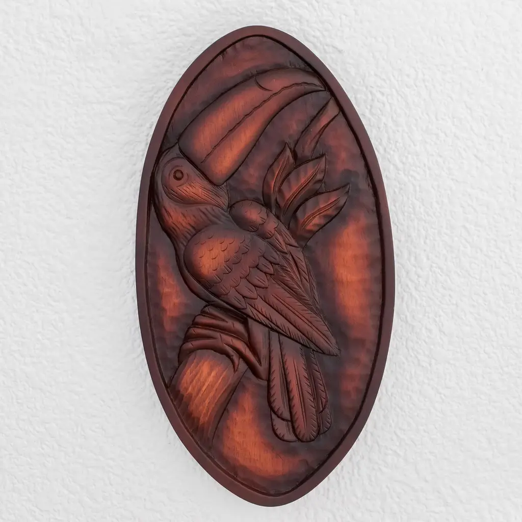 By Costa Rica's Christian Vasquez, this oval relief panel depicts an owl that watches over your home. Vasquez works with a single piece of pochote wood, hand-carving the relief with great detail. Says the artist, "For the majority of my life, I have been surrounded by nature. Due to my Costa Rican identity, the love that I feel for the Costa Rican landscape has inspired me to utilize my talent to translate them into beautiful works of art."