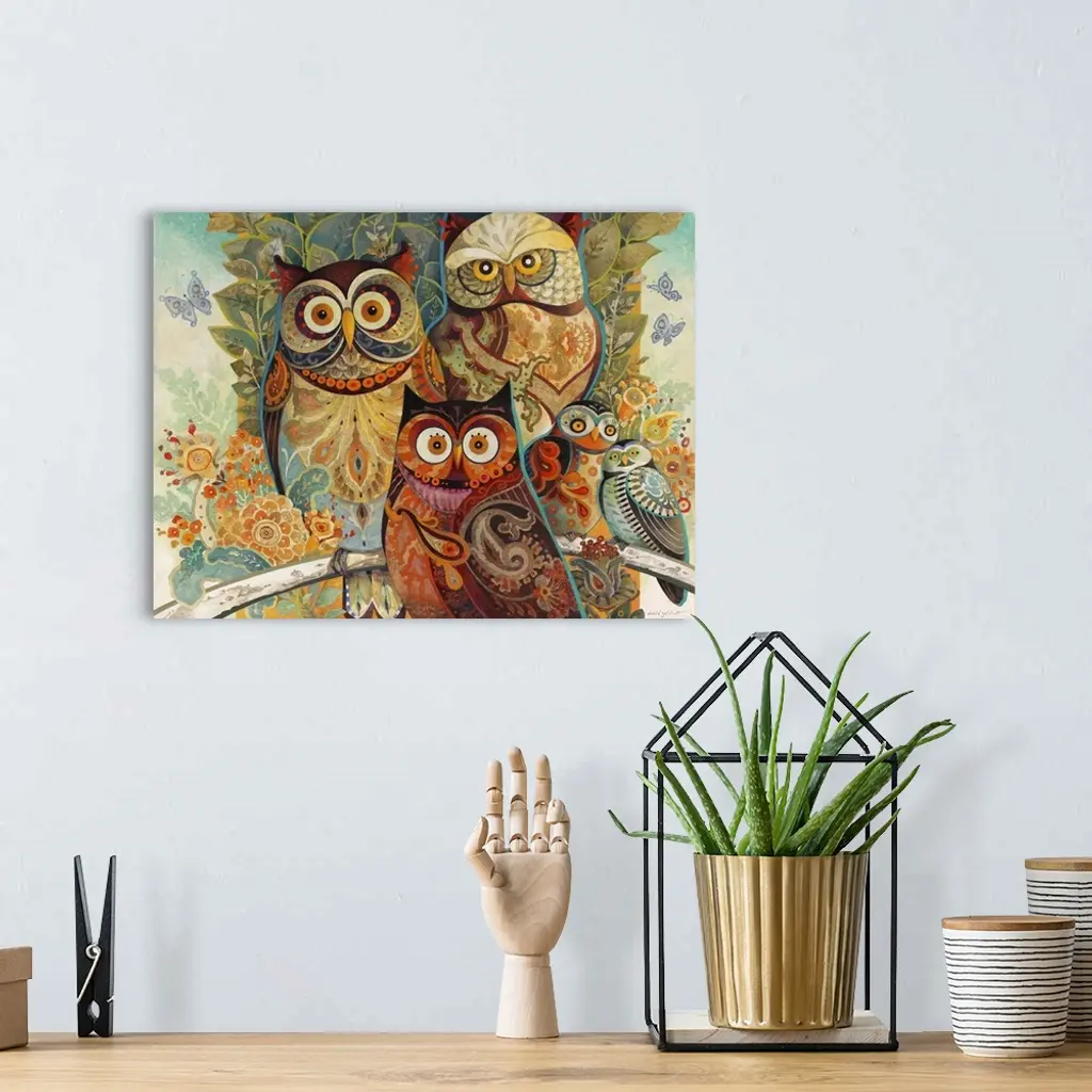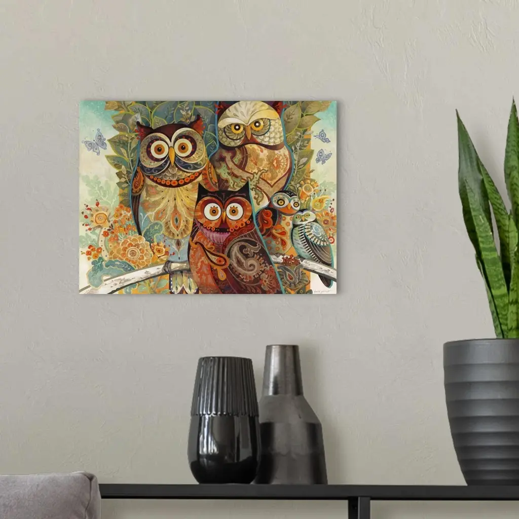 Illustration of several owls in colorful paisley patterns.