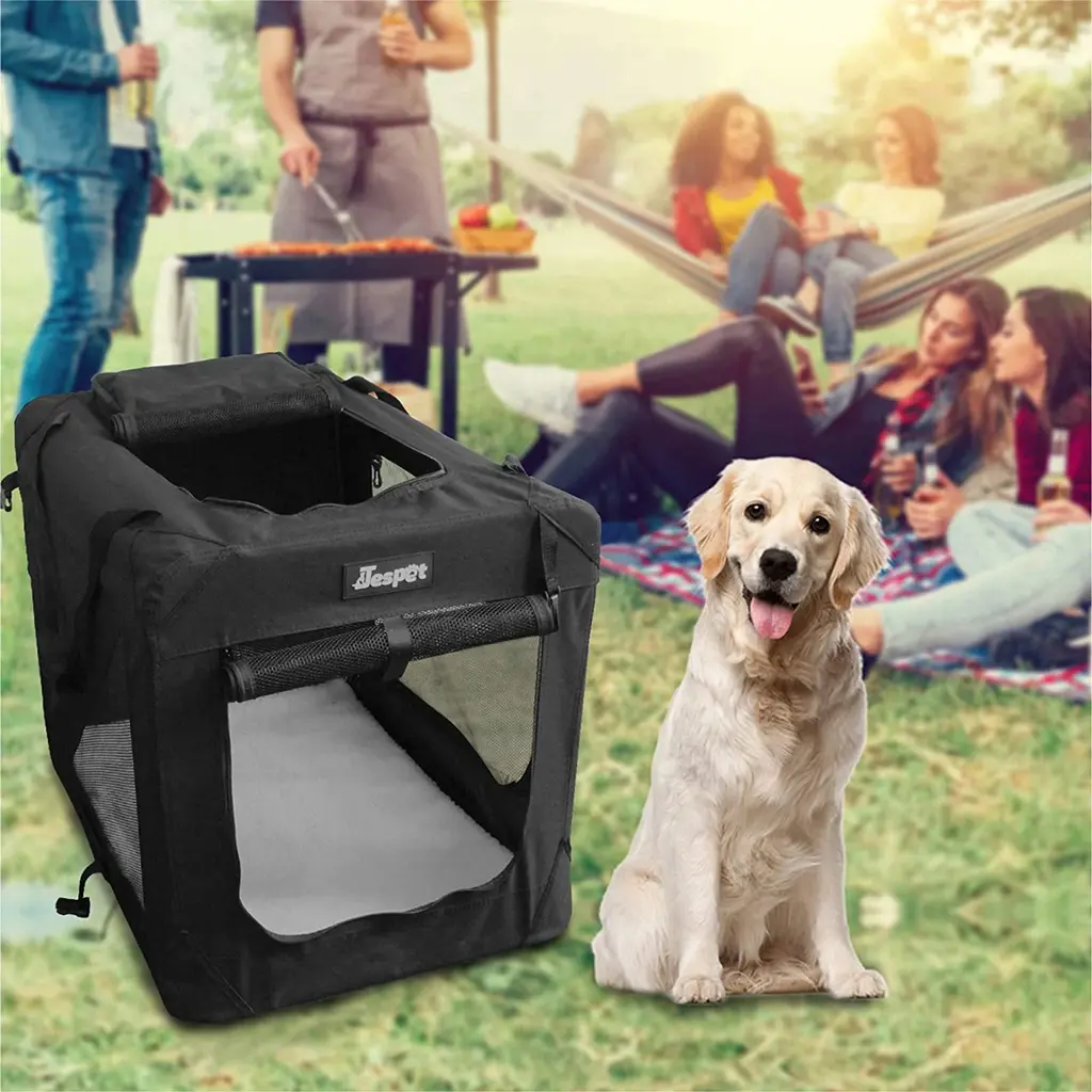 Folding and Portable: This collapsible dog crate is easy to set up and take down, making it convenient for travel, camping, and outdoor adventures. The lightweight design and foldable construction make it easy to carry and store, even in small spaces.Breathable and Visible: The soft dog crate has four mesh windows on all sides, providing good ventilation and visibility for your pet. The windows are made of durable mesh fabric and can be fully opened or closed to control the airflow.Durable & Secure: The soft-sided crate is made of high-quality materials, including a sturdy steel frame and a durable Oxford cloth fabric, ensuring long-lasting use and providing excellent protection for your pet. It also includes a dog leash to secure your dog inside the crate.Removable Cushion & Storage Bag: Features a soft, removable cushion for extra comfort and easy cleaning, creating a cozy resting spot for your pet. The storage bag helps keep your dog’s essentials,such as toys, treats, and grooming supplies, neatly organized and easily accessible.Spacious & Comfortable: The large dog crate measures 36 x 25 x 25 inches, providing ample space for your furry friend to move around comfortably, whether it's for napping, playing, or sleeping.Versatile Use: This portable dog crate is suitable for various occasions, such as outdoor activities, travel, training, or simply providing a safe and comfortable space for your pet at home.Package Included: 1 x Dog Crate