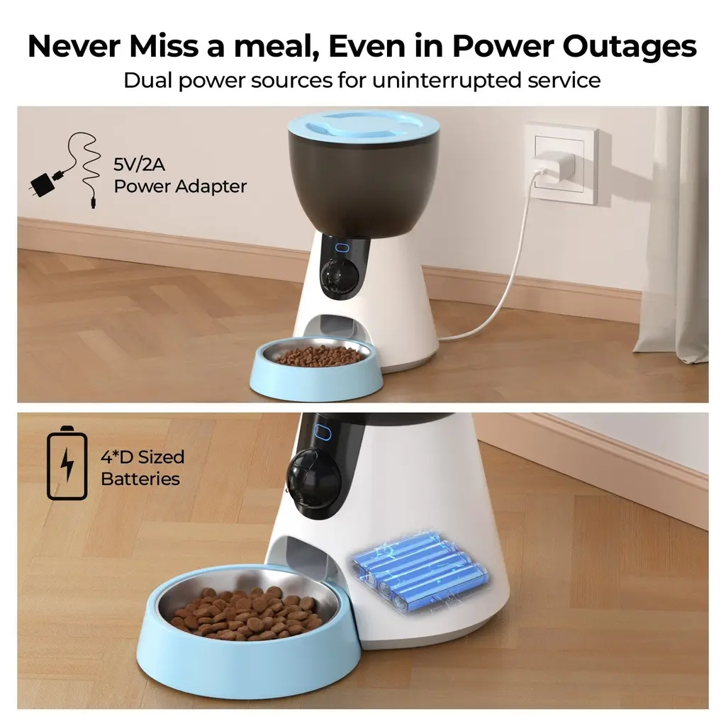 Smart Feeder: The automatic cat feeder supports 5GHz and 2.4GHz WiFi as well as Bluetooth, you can use your mobile phone to set and monitor your pet's diet through the official APP. Easy to set up feeding schedule, customise feeding time and portion size, up to 10 meals per day, 1-10 portions per meal. Running low on food alerts and use the offline feeding plan to make sure your pet is never hungry. Compatible with dry food, freeze-dried food and mixes from 2mm to 15mm. 1304P HD Camera: Automatically feeds with 1304P HD camera. It also supports infrared night vision and motion detection. Whether you are at work or on a business trip, day or night, you can have a clear view of your pet and feed it remotely. Please note that the battery power only supports the feeding function, not the camera function. (Can be powered by 4*D battery ,no included) Voice Talk Function: The two-way audio pet feeder allows you to communicate with your pet at any time, relieving your pet's separation anxiety. You can also set a 10-second feeding recording to make your pet feel like you are always there Motion Detection: The pet feeder has a motion detection function, you can adjust the sensitivity as needed. If it recognises that your pet is passing by, your mobile phone will receive an object movement alert message. Your mobile phone will receive a notification when there is a problem of insufficient food storage, food blockage, or WiFi disconnection Large capacity and easy to clean: the automatic cat food dispenser comes with a removable food chute and stainless steel bowl that can be rinsed directly with water, creating a healthy feeding environment for your cat. the large 4 litre/1 gallon capacity food container reduces the frequency of refillingSpecification: Color: White with blue Material: Handle material: ABS+304 stainless steel+silica adapter (device): USB 5V2A Frequency: 60Hz Rated power: 5W Grain drum capacity:4L(1Gal) Bowl capacity: 300ml(100g) Power cable: Elbow Type-C Cable Product Dimensions: 13.8 * 7.5 * 12.8 inch This is an automatic cat feeder with camera and voice function, supports 5GHz and 2.4GHz WiFi and Bluetooth, you can use your mobile phone to set up and monitor your pet's diet through the official APP. Easily set up a feeding plan, customise feeding times and portion sizes, up to 10 meals per day, 1-10 portions per meal. Use the offline feeding plan to make sure your pet is never hungry. With 1304P HD video with night vision, you can observe your pet's movements at any time, and you can also have a voice dialogue to ease your pet's separation anxiety and feel like you're always around. The feeder also features motion detection and blockage alerts, it recognises your pet passing by and your mobile phone will receive an object movement alert message. Your phone will also be notified when there is a problem such as insufficient food storage, food blockage or WiFi disconnection. Can be dual power supply mode, when using battery charging, the battery power only supports the feeding function, does not support the camera function. (Battery is not included in the product). Whether you are at work or travelling, day or night, this smart pet feeder provides remote feeding service for your pet.
