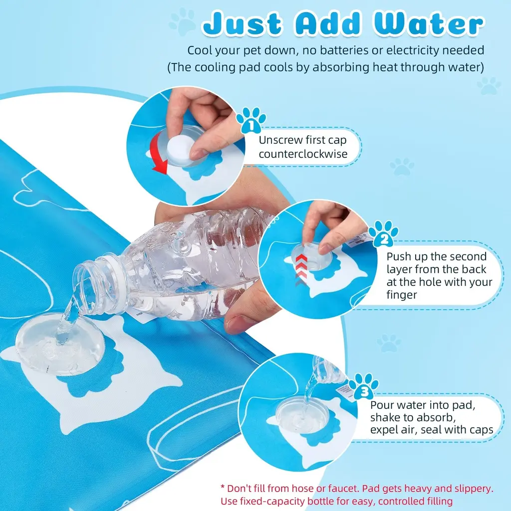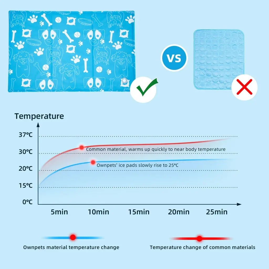 Leak-proof & Safe Design: Water-filled mat with reinforced seams to prevent leaks, gel-free and non-toxic for pets who chew. Indoor & Outdoor Use: Perfect for living rooms, sofas, car seats, rooms, outdoor lawns, beaches, and more. Long-Lasting Cooling: Water-absorbing technology provides continuous cooling, no electricity needed. Durable & Easy Clean: Scratch-resistant Oxford fabric, wipe-clean surface (not machine washable). 3 Size Options: L (39.4" x 23.6"), XL (43.3" x 27.6"), XXL (47.2" x 31.5") for all pet sizes.Product Overview: The Ownpets Pet Cooling Mat is designed to keep your dogs and cats cool and comfortable during hot weather. Utilizing water-filled technology, this mat absorbs heat to provide long-lasting cooling without electricity. Ideal for both indoor and outdoor use, it features a durable Oxford fabric exterior and a water-absorbing sponge layer for resilience and easy maintenance. Available in three sizes to suit pets of all breeds, this mat is a simple and effective solution for summer heat relief. Just fill it with water, and it’s ready to use!Specification: Color: Sky Blue Material: Oxford Cloth with Sponge Product Size: L (39.4" x 23.6"), XL (43.3" x 27.6"), XXL (47.2" x 31.5")