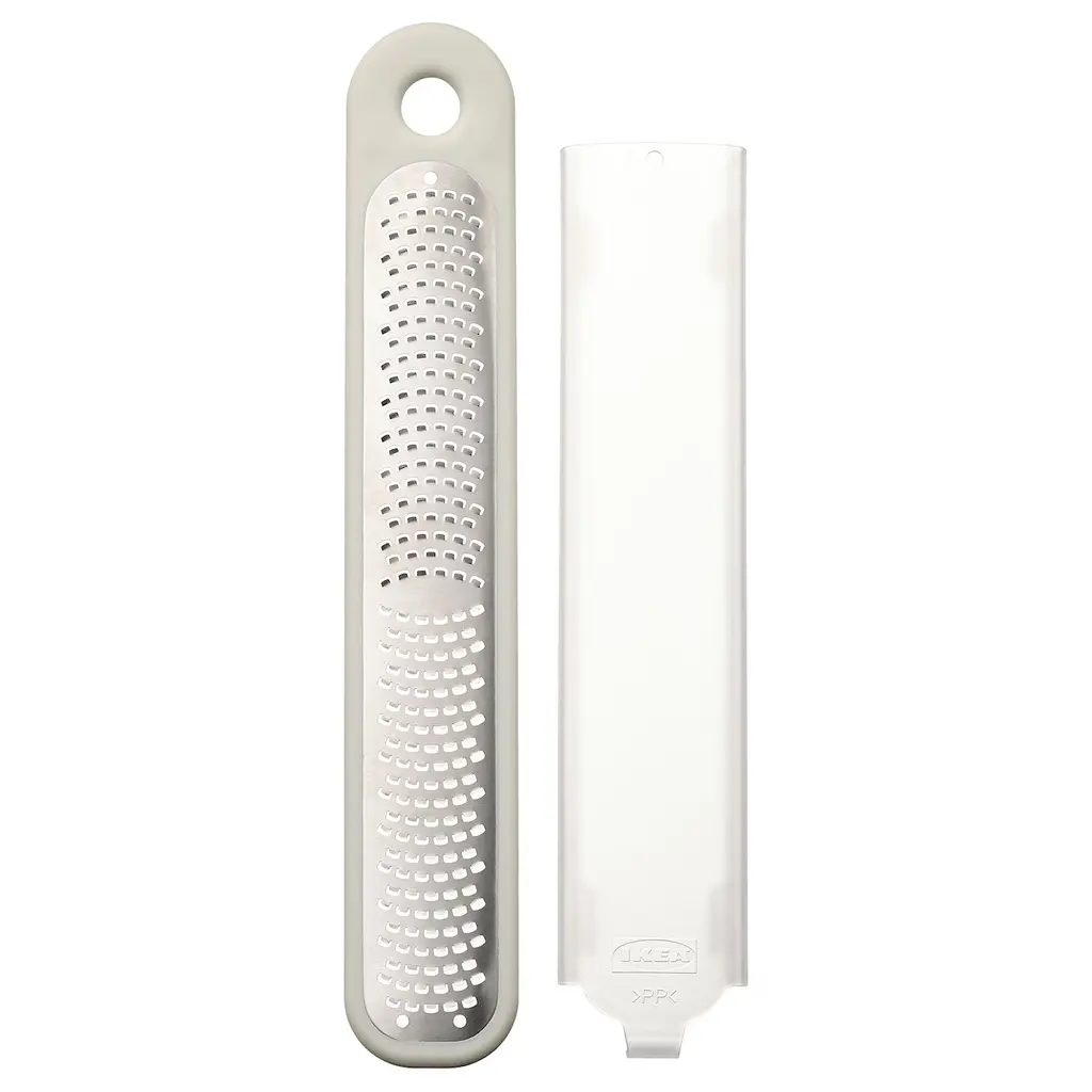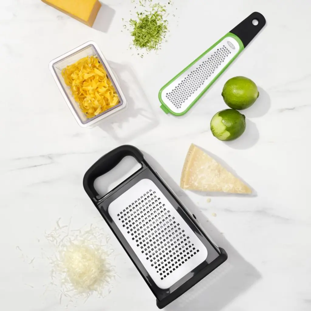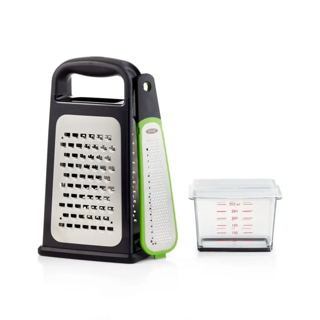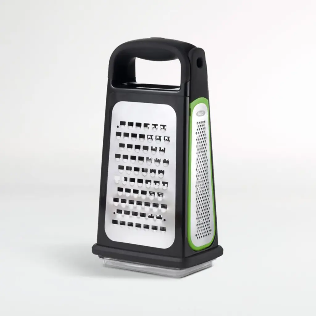 Grate, slice and zest with this easy-to-use gadget. The four-sided box grater includes a soft-grip handle, non-slip base and a stainless steel slicer, medium grater, coarse grater and removable zester. The zester pops out for easy use and cleanup when you just need citrus, cheese or chocolate zest. For neat grating and measuring, place the box grater over the clear plastic container, then snap on the lid to store your ingredients until you need them.OXO has been creating practical and accessible kitchen tools for over 25 years.