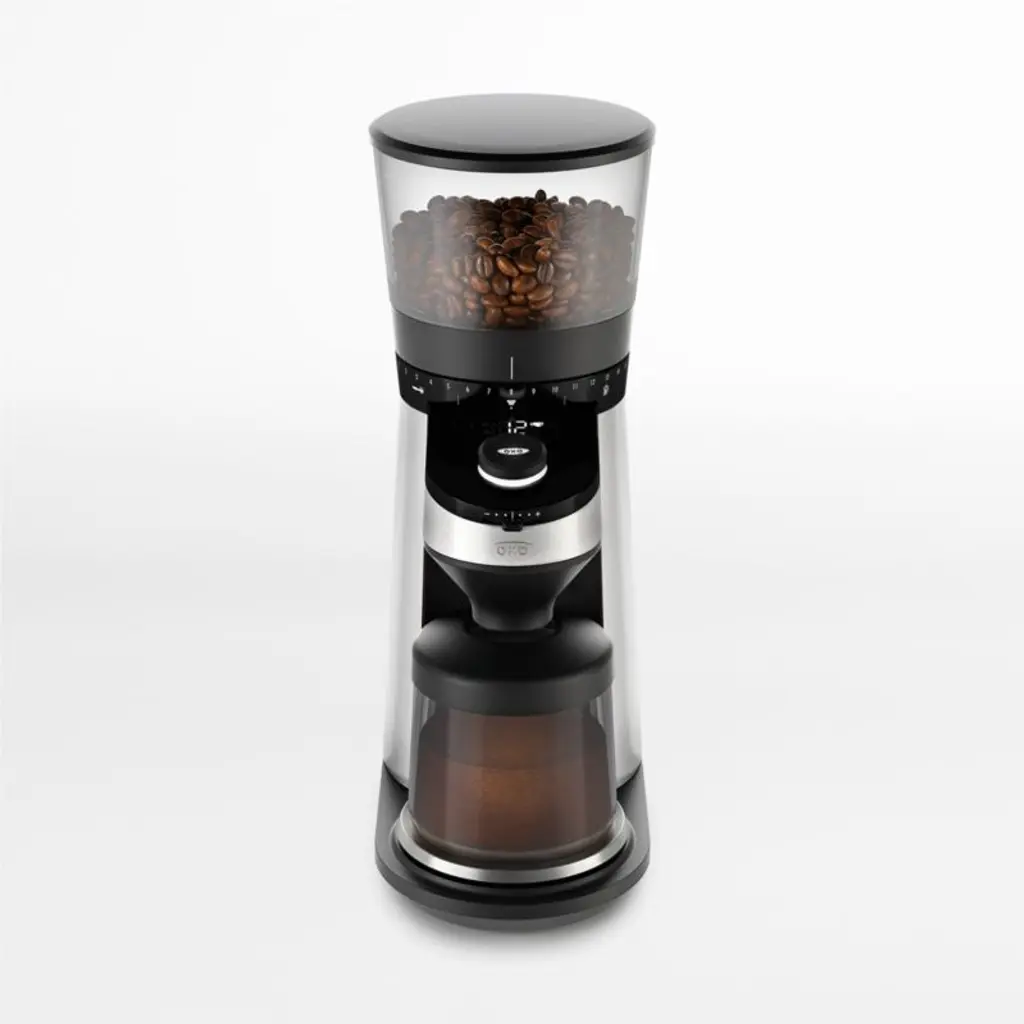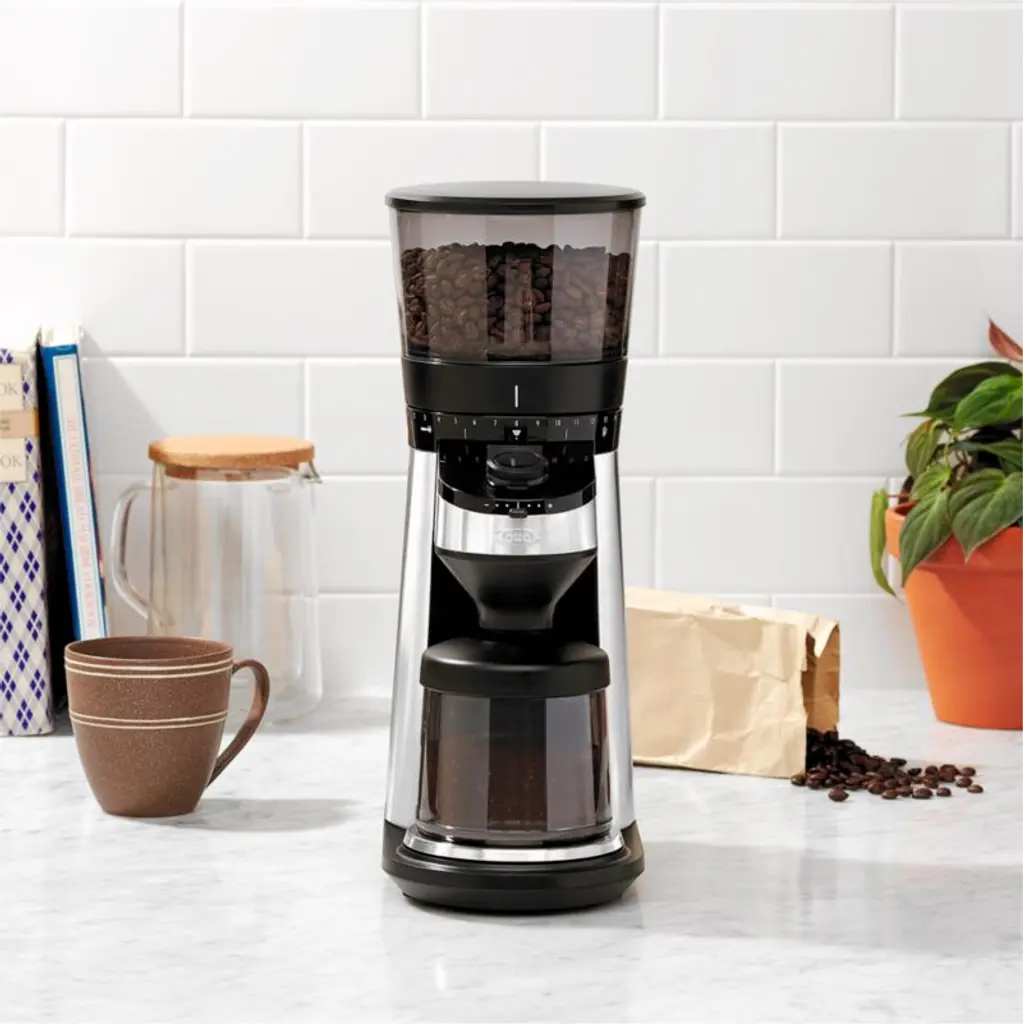 Whether your brew of choice is French press, pour-over, espresso or automatic, a burr grinder will enhance the flavor of coffee by grinding beans into more uniform grounds for enhanced flavor and aroma. This conical burr grinder uses stainless steel burrs and a low-speed motor to prevent overheating, offering 38 settings for grinds fine to coarse. Choose the Cups mode to grind beans based on the number of cups you'd like to brew, or use the built-in digital scale and the Grams mode to achieve precise grounds-to-water brewing ratios. Holding up to a pound of beans, the tinted hopper shields against flavor-damaging UV rays and has a trap door to save unground beans when the hopper is removed.OXO has been creating practical and accessible kitchen tools for over 25 years.View all Oxo Tools & Gadgets