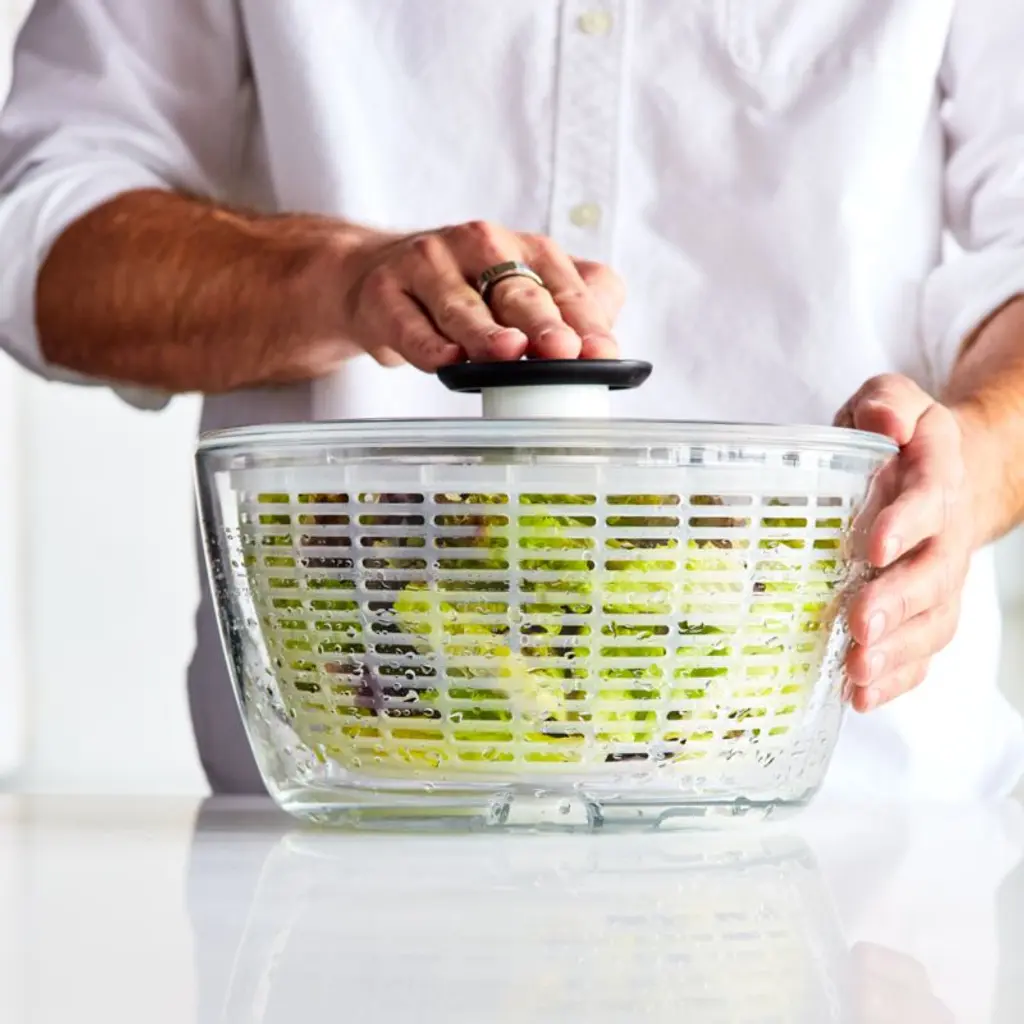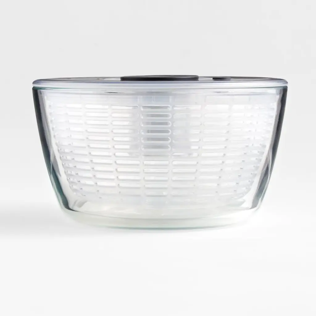 A durable glass bowl elevates OXO's top-rated salad spinner. Simply rinse greens in the basket, place in the bowl and pump to spin dry. The patented brake stops the spinning when you're done. The glass bowl is lovely enough for serving salads, and the basket insert doubles as a colander for other rinsing and draining tasks. The glass salad spinner cleans up easily in the dishwasher.OXO has been creating practical and accessible kitchen tools for over 25 years.