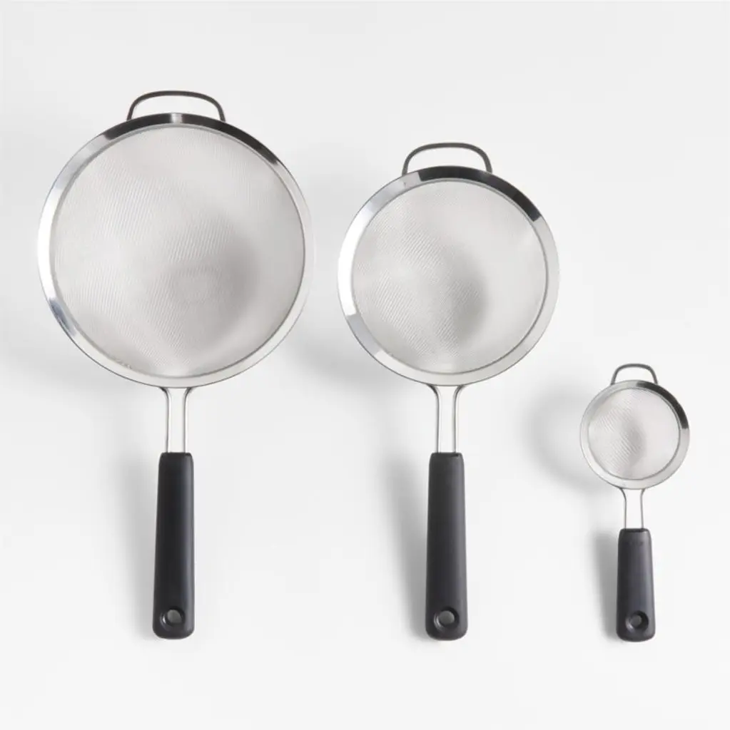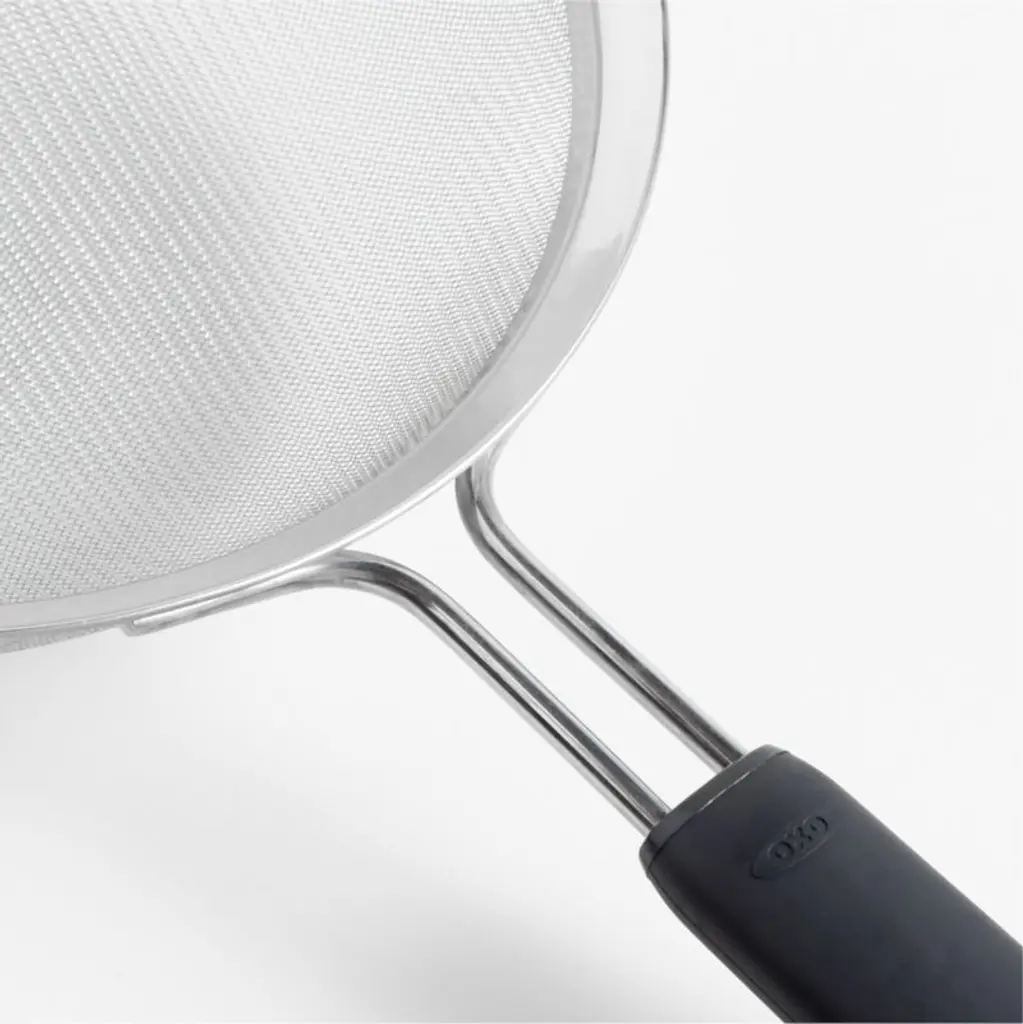 A strainer comes in handy so often, from sifting dry ingredients for cookies to draining pasta to rinsing broccoli. Stainless steel shapes a fine mesh bowl attached to a nonslip handle with a sturdy double-rod design. The wide rim and loop stabilize the sieve when it's placed over a pan or bowl. The mini strainer cleans up easily in the dishwasher between uses.OXO has been creating practical and accessible kitchen tools for over 30 years.