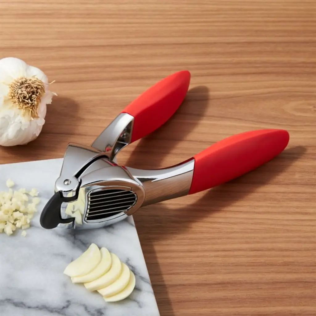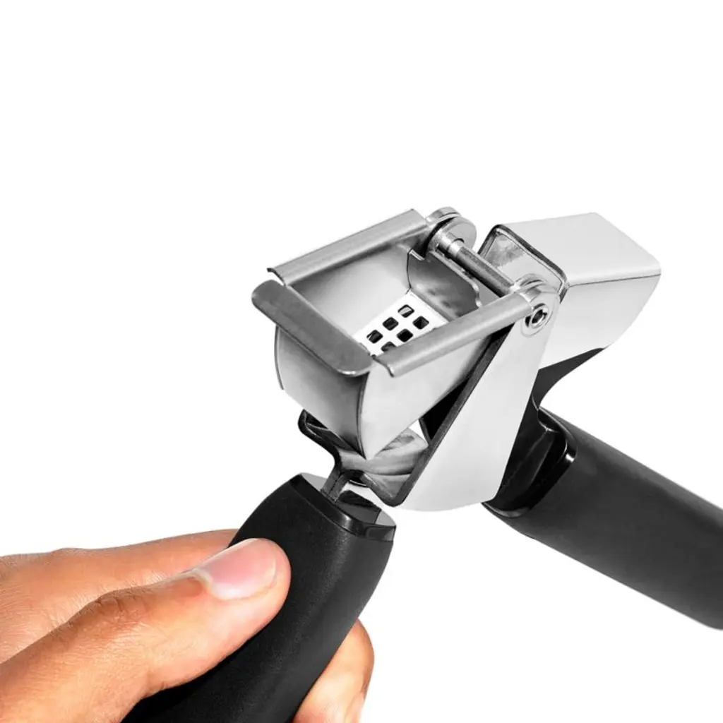 Designed with a comfortable grip for easy squeezing, this large-capacity garlic press lets you crush multiple cloves at once. The durable stainless steel press swings open for easy loading and dispenses crushed garlic through efficient perforations without getting it stuck in the press.OXO has been creating practical and accessible kitchen tools for over 30 years.