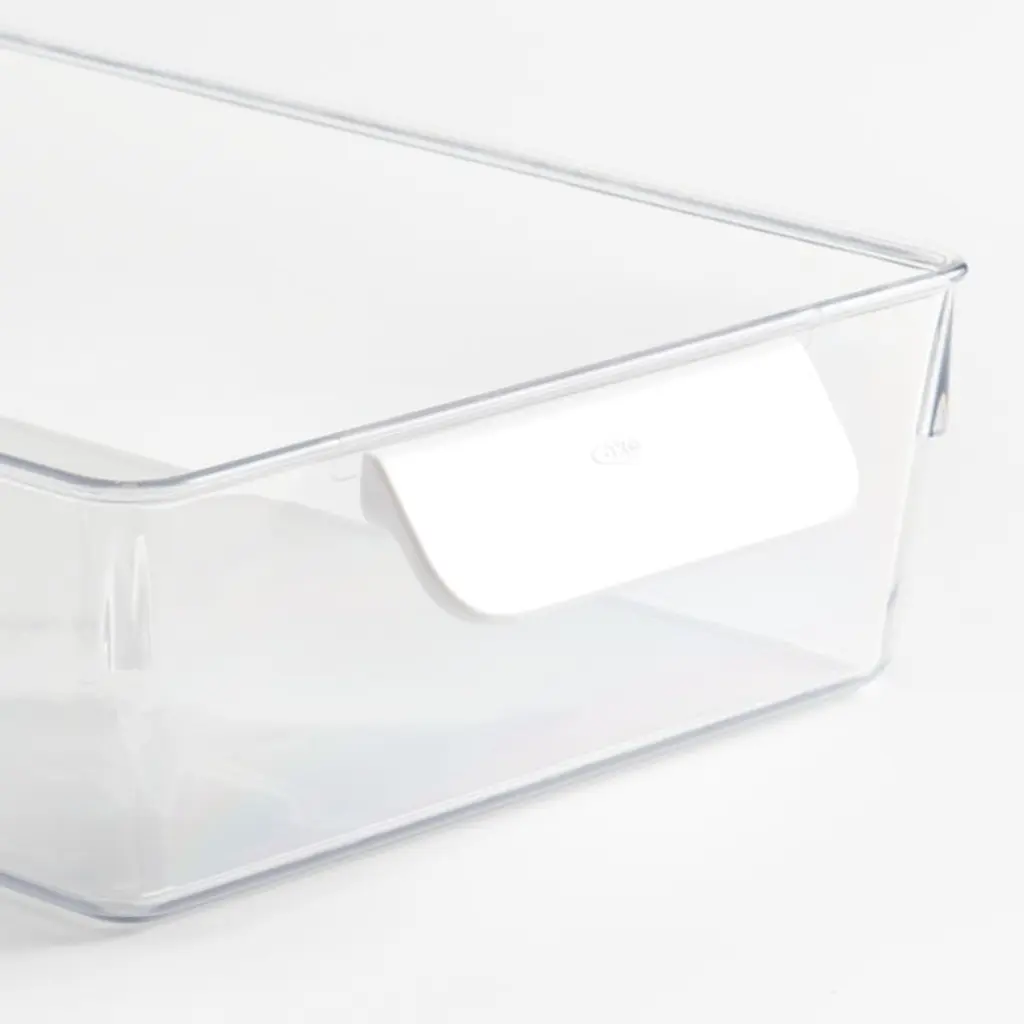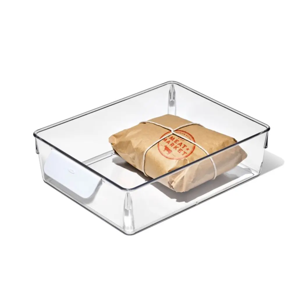 Refresh your refrigerator with this versatile bin. Ideal for corralling condiments, deli meats, carrots and other essentials, the large bin upgrades your food storage with a crisp, clean look while making the most of back-of-the-fridge space. Clear plastic construction keeps contents visible and glides smoothly as you slide the bins in and out using the comfortable white handles. Use the bin in multiples or pair with other sizes to give your fridge an instant makeover.OXO has been creating practical and accessible kitchen tools for over 30 years.View all OXO Kitchen Storage