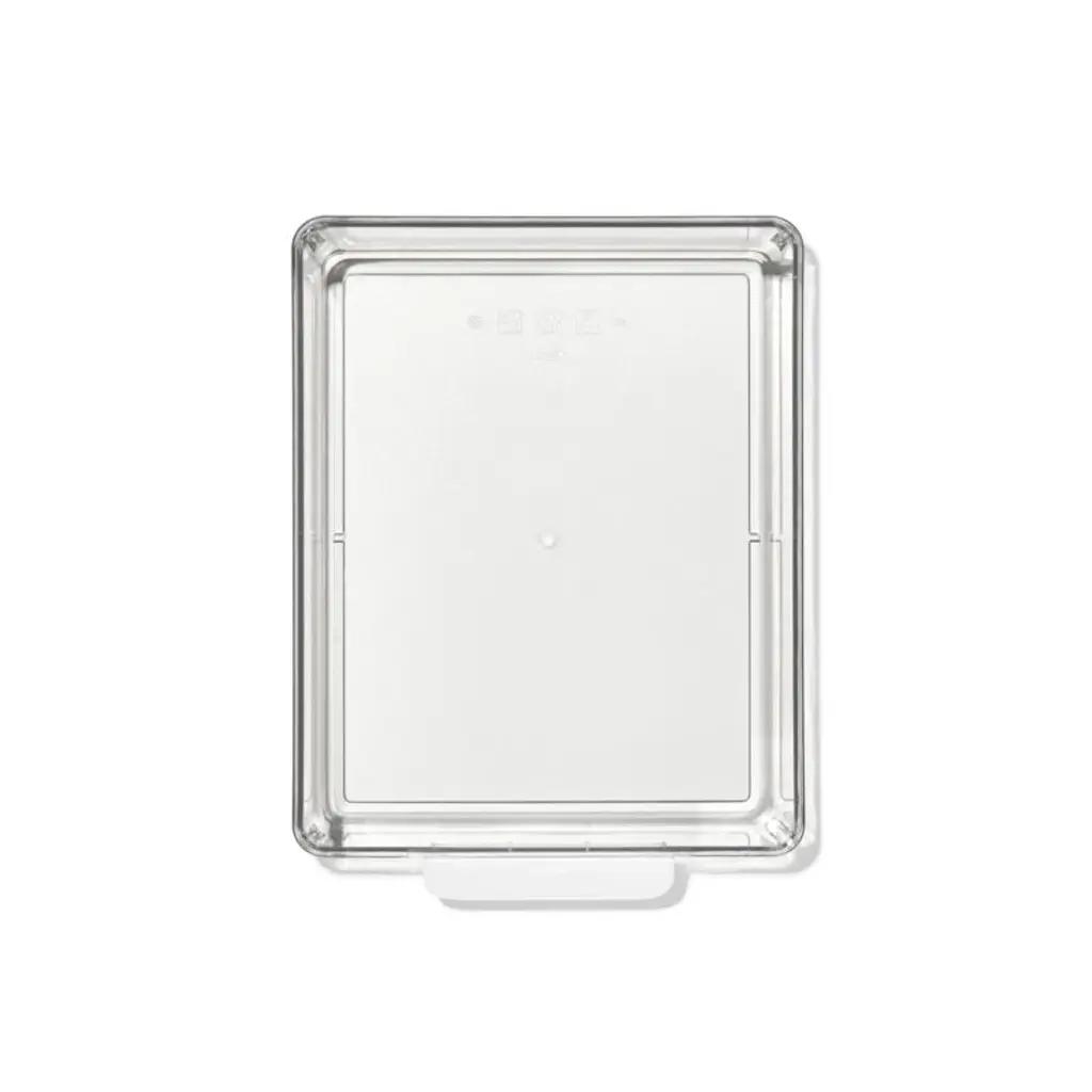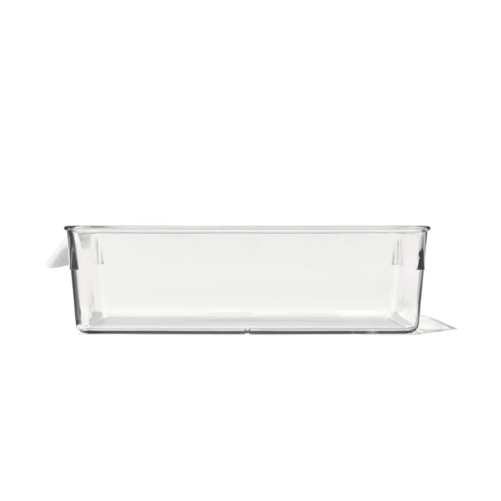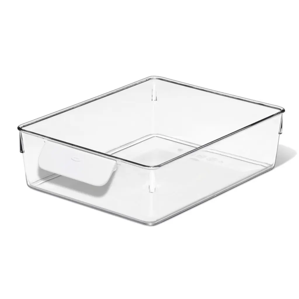 Refresh your refrigerator with this versatile bin. Ideal for corralling condiments, deli meats, carrots and other essentials, the large bin upgrades your food storage with a crisp, clean look while making the most of back-of-the-fridge space. Clear plastic construction keeps contents visible and glides smoothly as you slide the bins in and out using the comfortable white handles. Use the bin in multiples or pair with other sizes to give your fridge an instant makeover.OXO has been creating practical and accessible kitchen tools for over 30 years.View all OXO Kitchen Storage