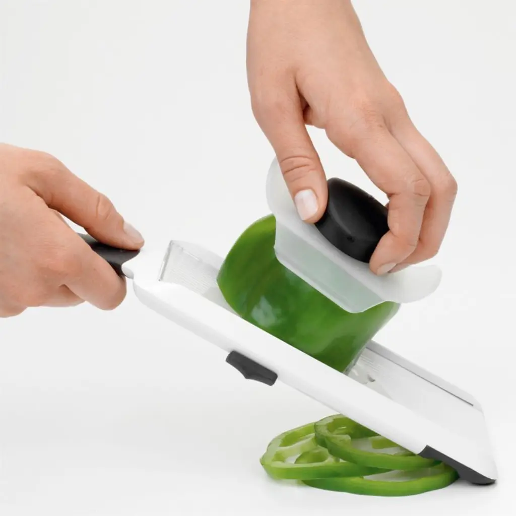 With a soft-grip knob, sharp stainless blade, and view-through base OXO® versatile, hands-on prep tool cuts even slices in three thicknesses onto a cutting board or right over a plate or bowl. Food holder protects hands and cover the blade when not in use; soft foot hooks over bowl for slicing stability.