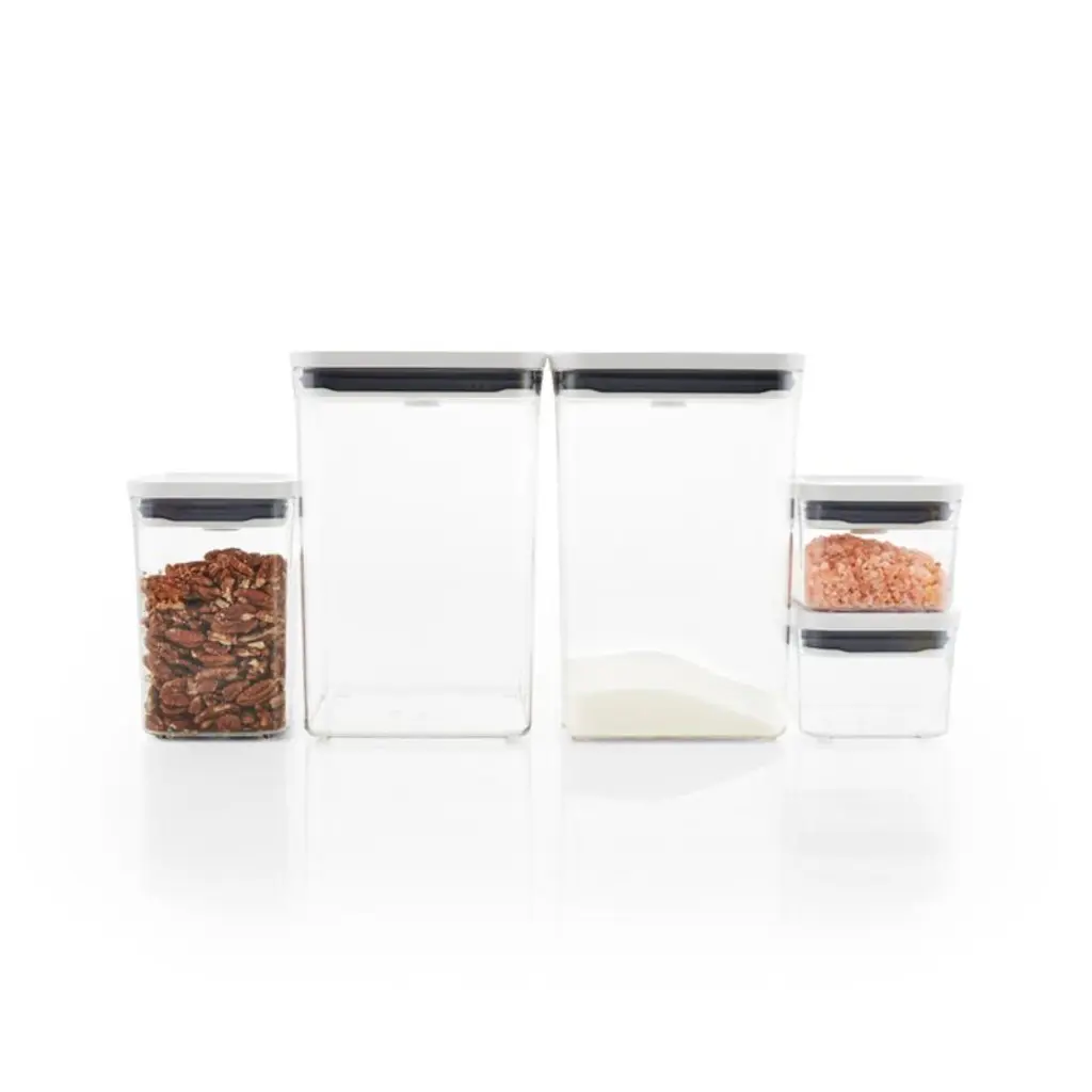 Create the ultimate baking pantry with this ingenious container set. The airtight, stackable canisters feature round corners for easy scooping and push-button opening and closing mechanisms. Five-pound bags of flour and sugar fit perfectly into the two large containers, while the medium vessel accommodates a one-pound box of brown or powdered sugar. Two small containers hold baking powder and baking sodaor fun add-ins such as chocolate chips. This set also includes three handy accessories that snap onto the bottom of the lids so they're right where you need them. The clever brown sugar saver, a terracotta disk, keeps your brown sugar soft. The two scoops portion out baking ingredients and serve double-duty as ½-cup measuring cups. Set includes two 0.4-quart, one 1.1-quart and two 4.4-quart containers, two ½-cup scoops and brown sugar keeper.View all OXO products
