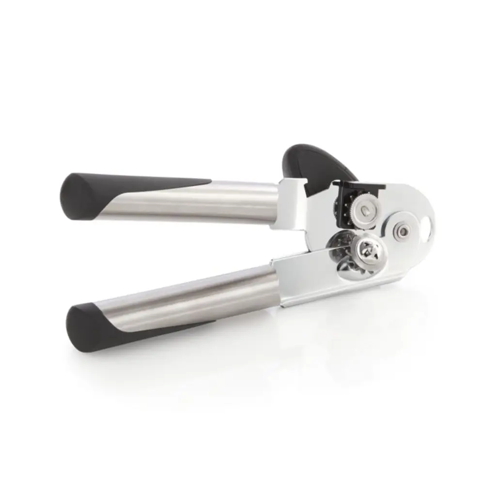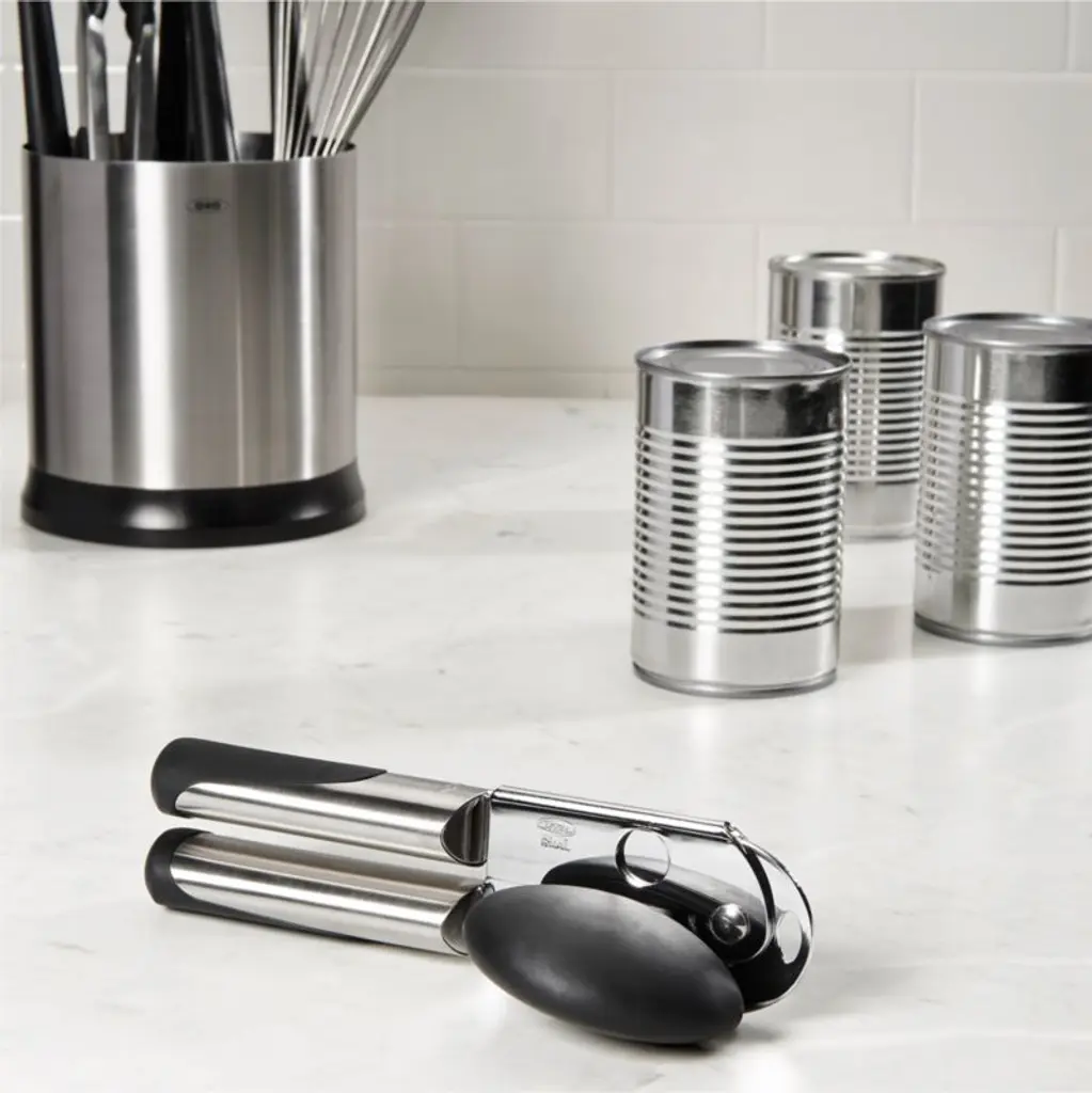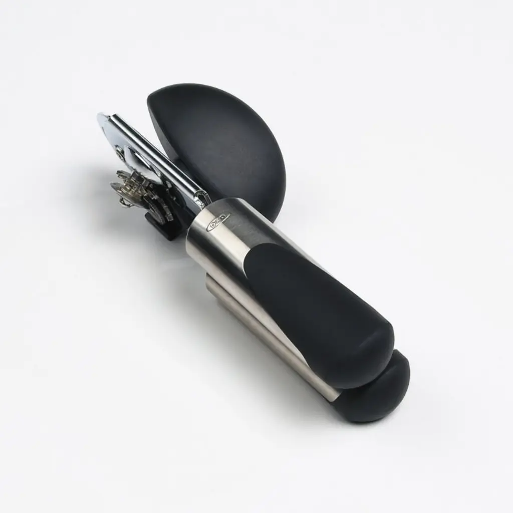 This smooth-operating can opener features generous comfort-grip handles that absorb pressure and an easy-turn large soft knob. A convenient built-in bottle opener adds utility. Accented with black, the modern opener looks sleek in stainless steel.OXO has been creating practical and accessible kitchen tools for over 25 years.