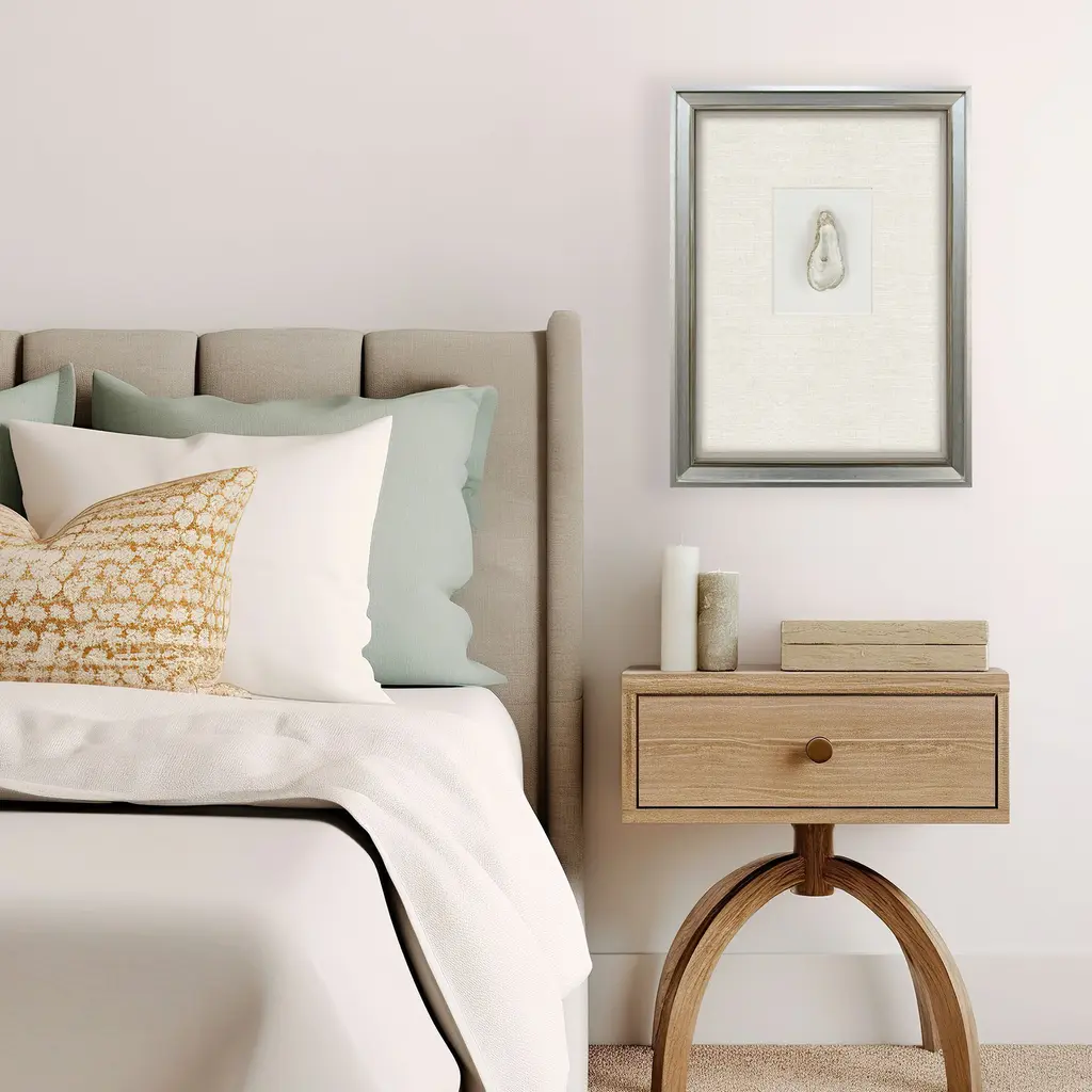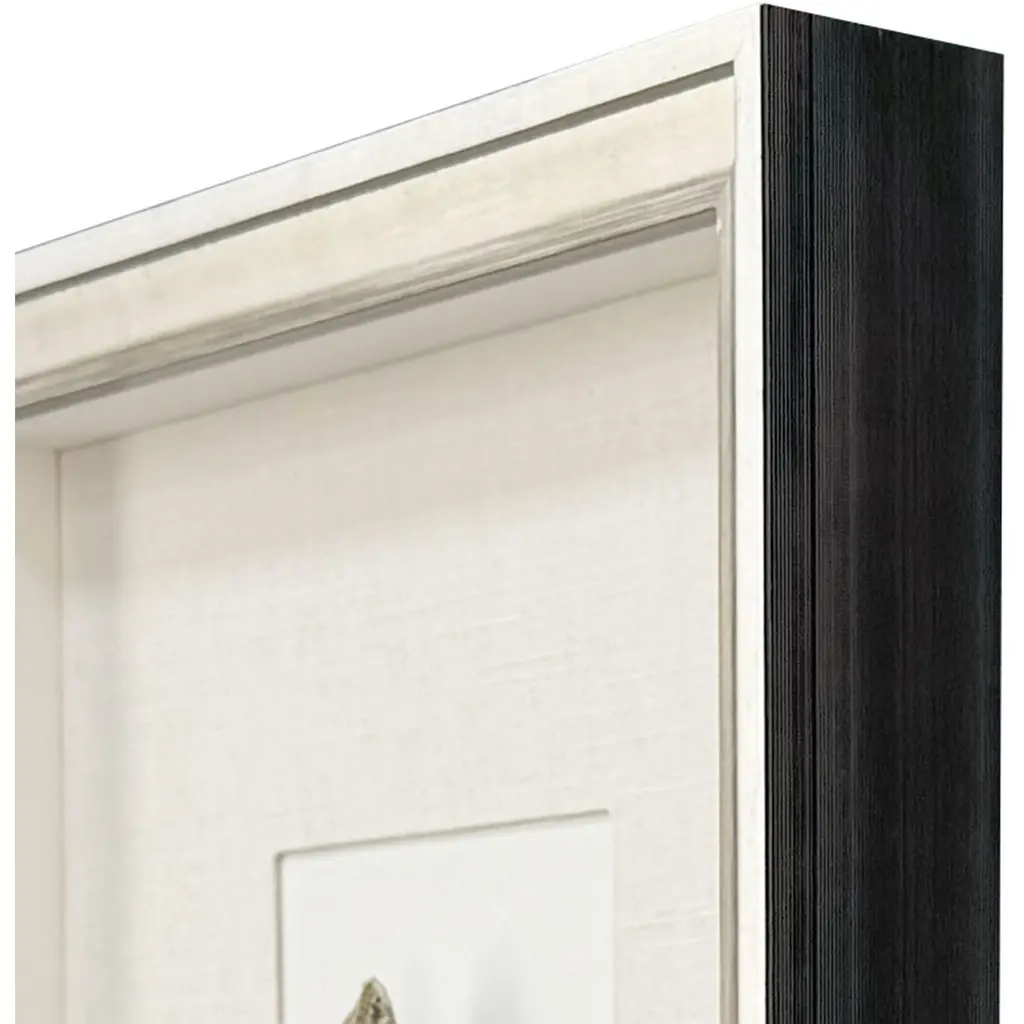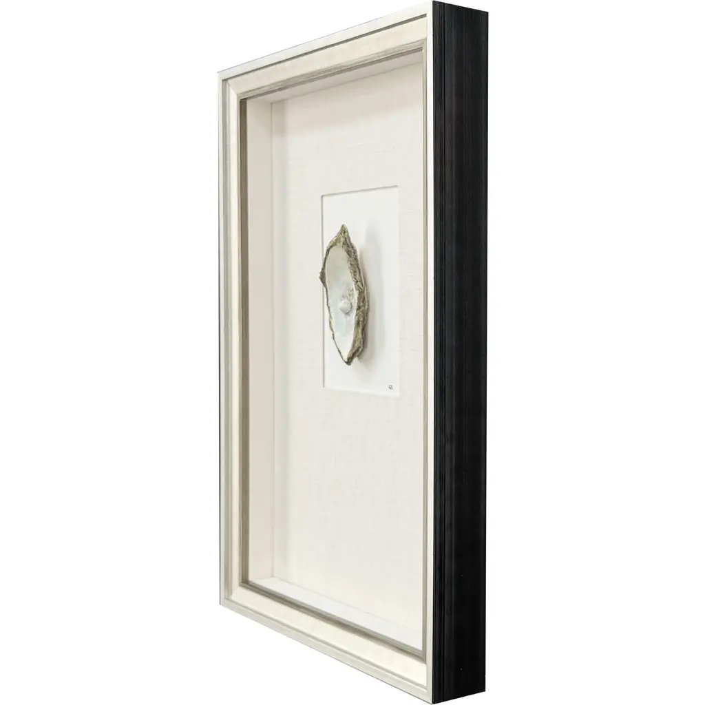 A hand cast plaster oyster shell is complemented with off-set fabric wrapped matting. Shadow boxed and framed in a silver leaf wood with gold edging.