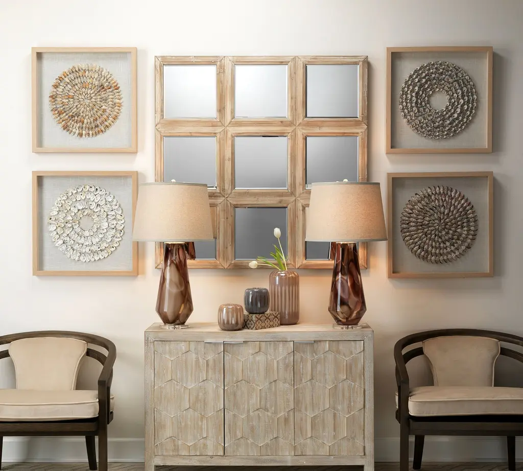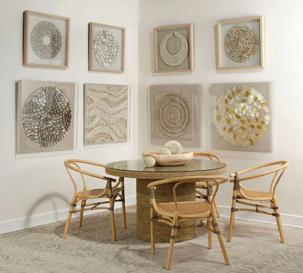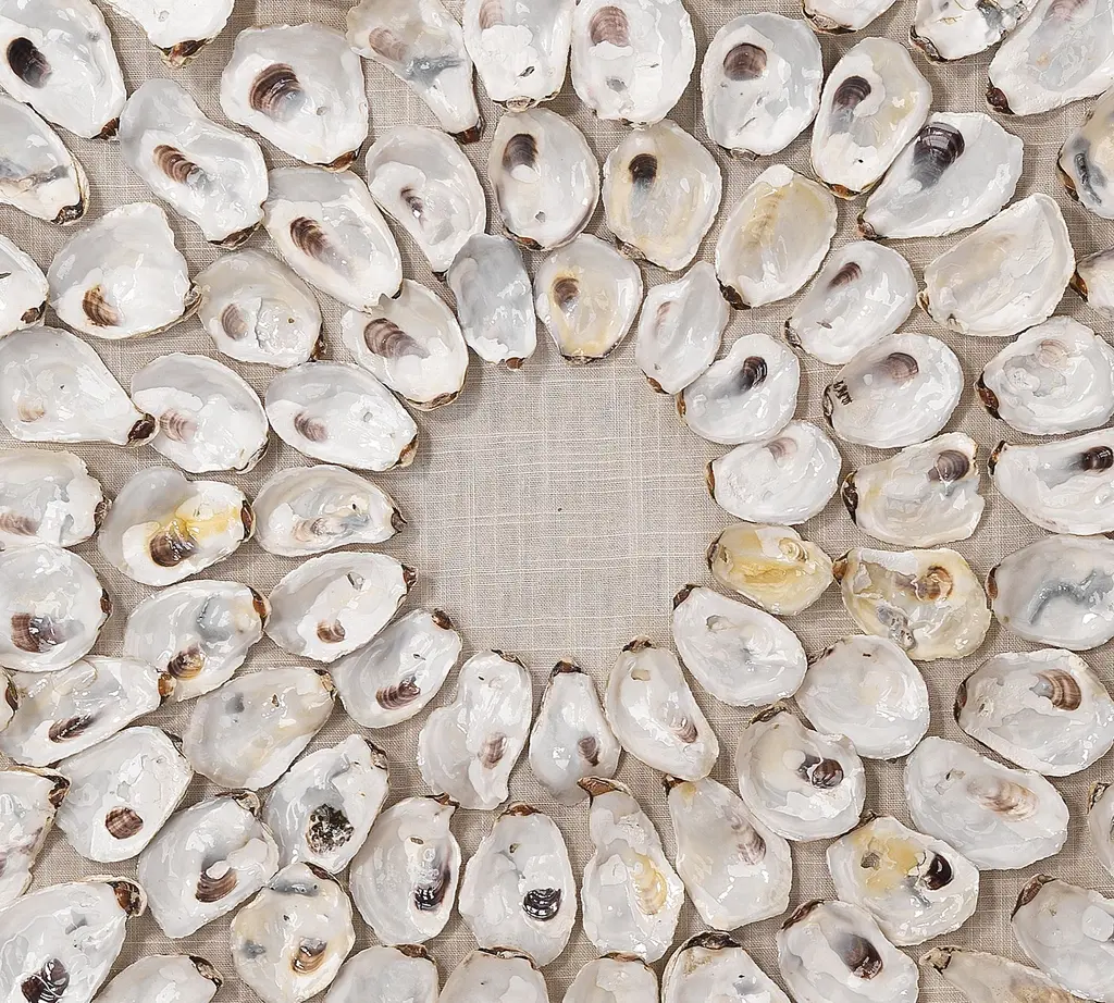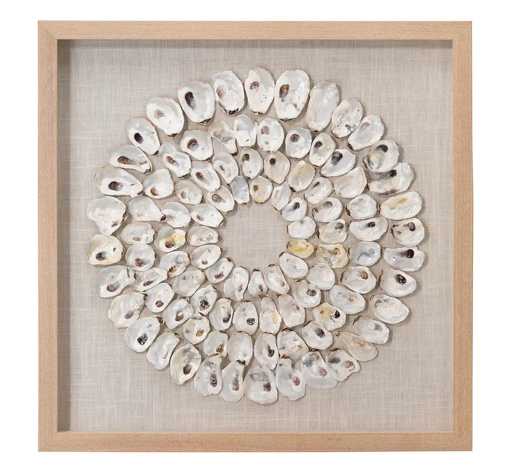 An assortment of delicate shell shapes arrayed in concentric circles characterizes this captivating shadow box. Set upon a linen backdrop and framed in wood, the radial pattern highlights its mesmerizing organic beauty with a range of natural seaside colors and textures.