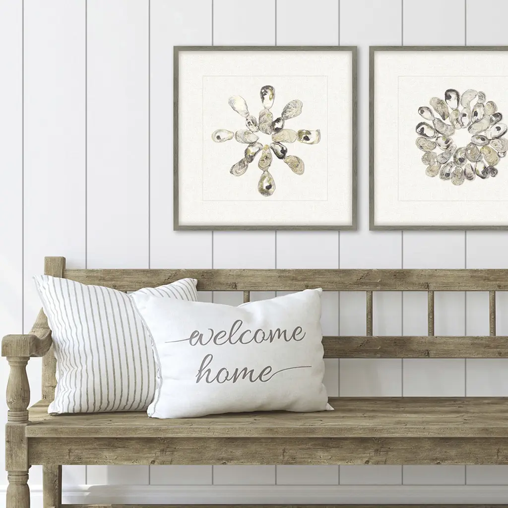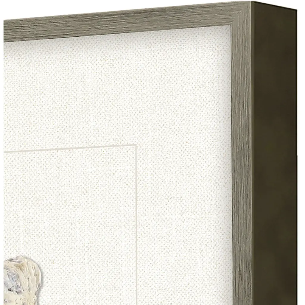 Natural oyster shells are mounted by hand onto a premium matboard. Framed in a block profile shadow box style wood in dark taupe.
