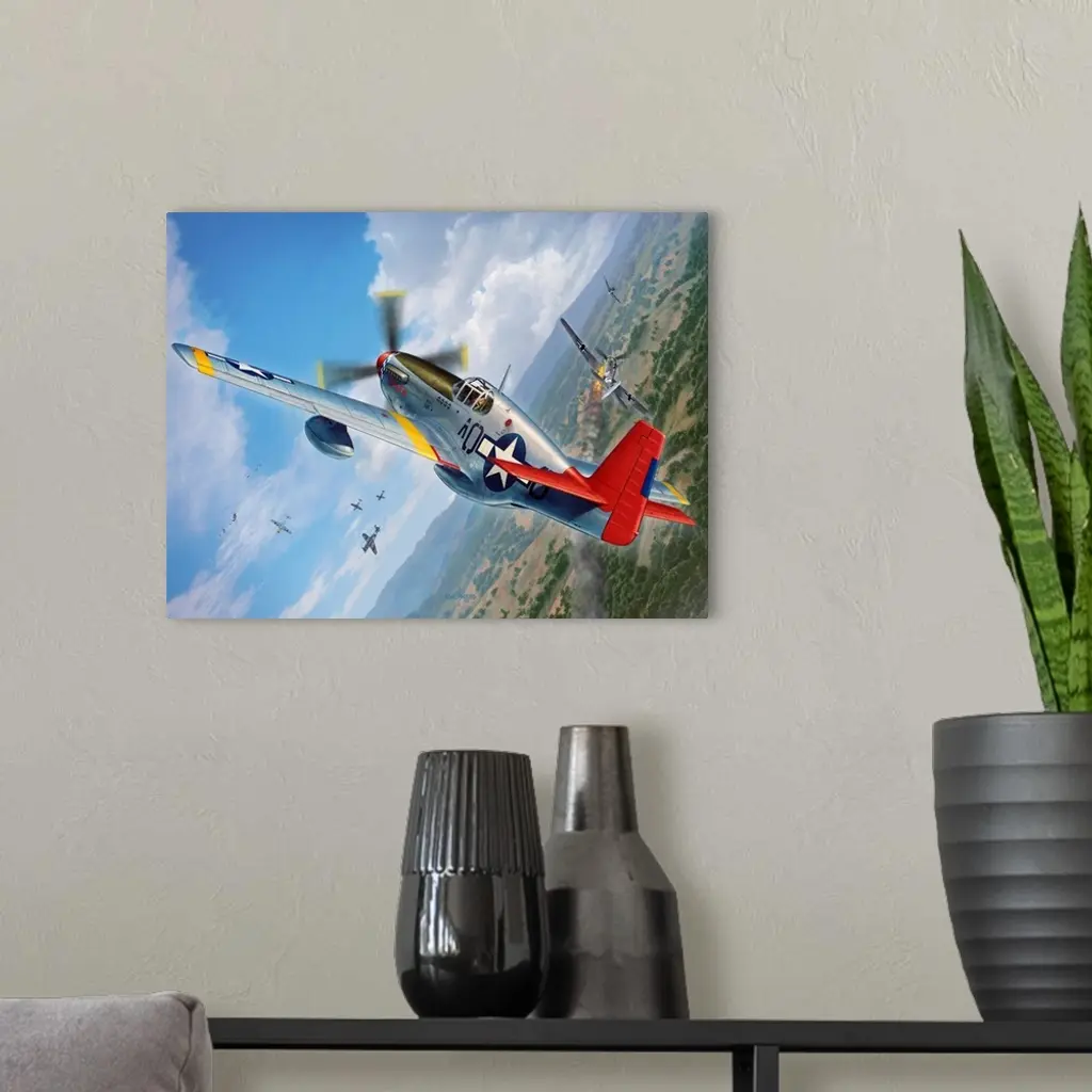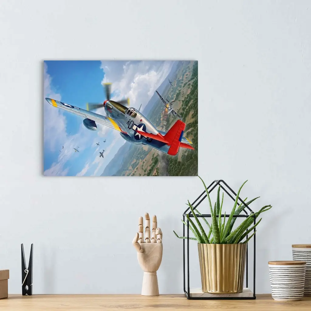 A P-51C Mustang belonging to the famed fighter squadron known as the "Tuskegee Airmen" shoots down a Messerschmitt ME-109 as an aerial battle commences somewhere over Italy, 1944.