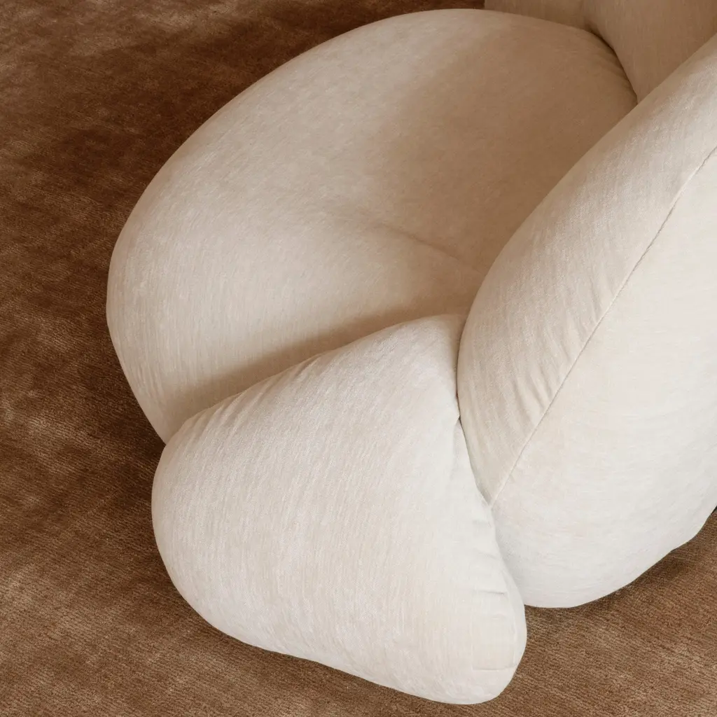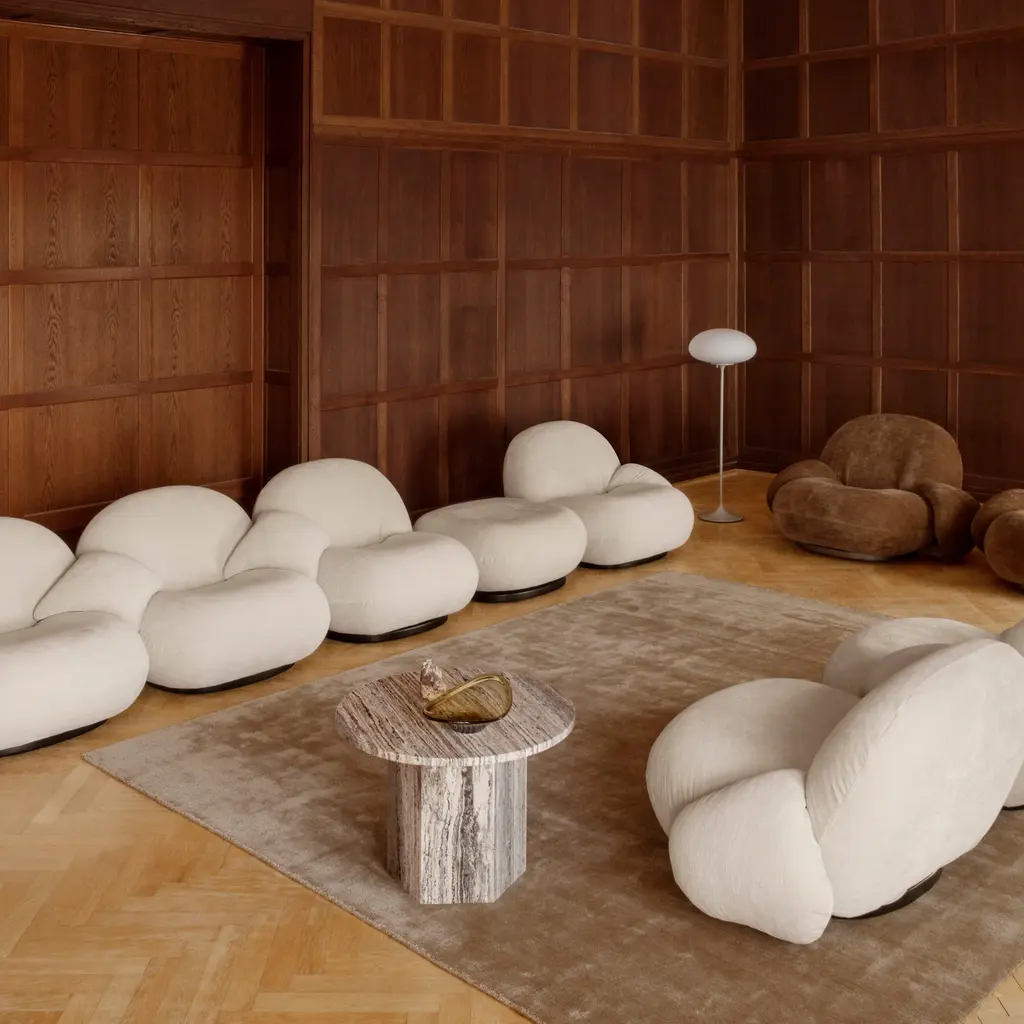 In Pacha’s more compact 2-Seater, the addition of a separate movable ottoman fulfills the seating’s promise of complete ease. Low armrests at the sides provide support and also allow for changeable sitting positions. Pierre Paulin’s iconic ‘70s cloud-like sofa combo is grounded in ergonomic precision and unstinting craftsmanship. Now revived by Gubi, it comes with either a black or pearl gold base and offers extensive upholstery options.