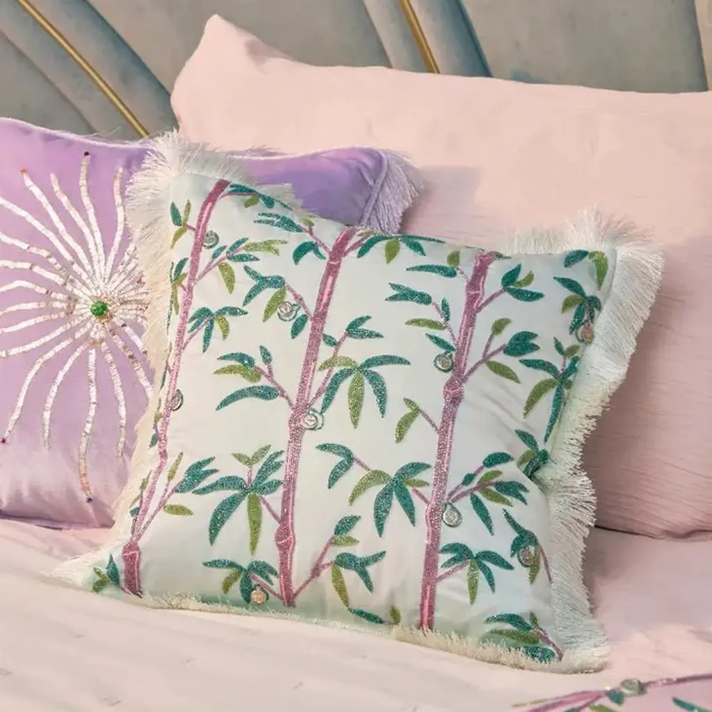 Poodle & Blonde's signature money tree print updated with Oceanus flair. Hand embroidered on a soft mint silk with delicate fringe trim. Size - 16 x 16